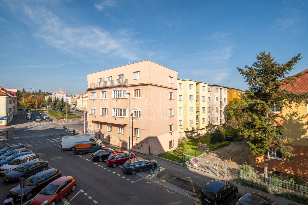 Bytový dům se nachází ve vedlejší méně frekventované ulici. Ke stanici metra A Strašnická se můžete svézt 1 zastávku tramvají nebo dojít pěšky za 5 minut.