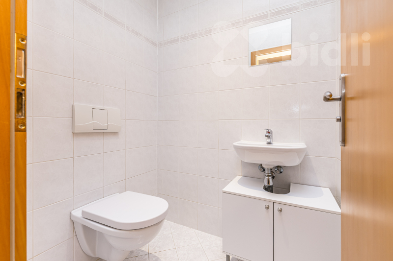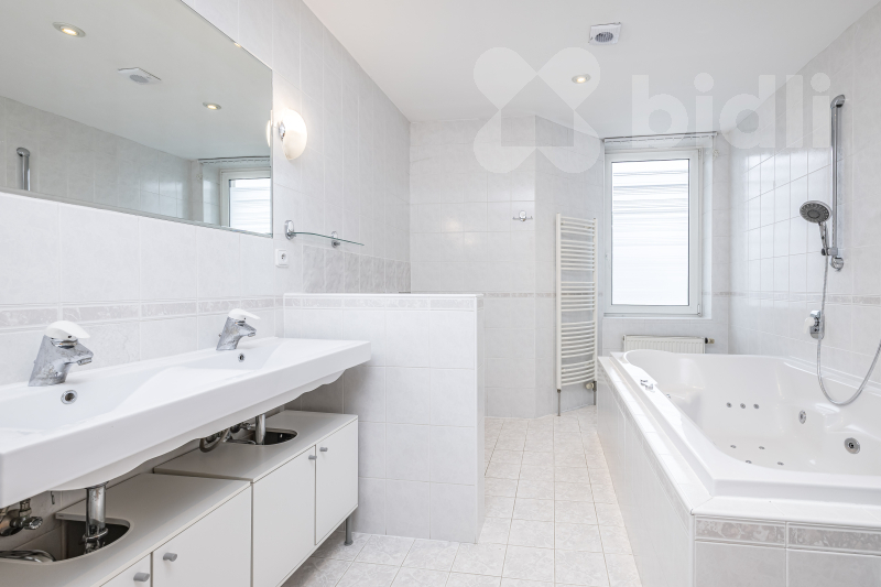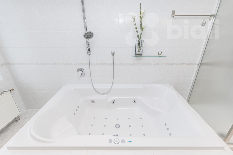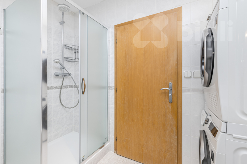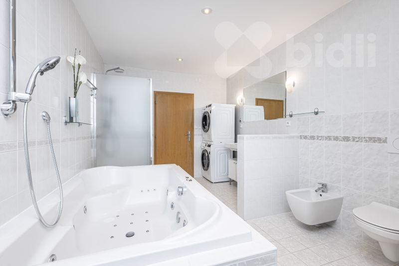 Velkorysá koupelna s velkou vířivou vanou poskytuje příjemné zázemí pro relaxaci, nechybí ani druhá toaleta. K praktickým benefitům patří také dostatek úložných prostor, vestavěné skříně, postel a k dispozici je rovněž pračka se sušičkou, což výrazně usnadňuje každodenní provoz domácnosti.