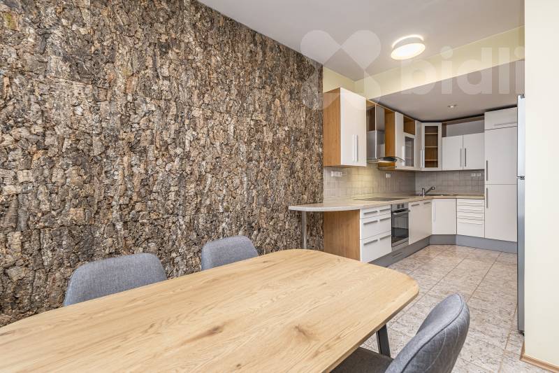 Hlavní obytný prostor působí velmi vzdušně a díky velkým oknům je krásně prosvětlený po celý den. Moderní kuchyň je přirozeně propojena s jídelní částí a je plně vybavena spotřebiči, takže poskytuje maximální komfort pro každodenní fungování domácnosti. Byt dále disponuje třemi samostatnými pokoji a nabízí dostatek flexibility pro rodinu, domácí pracovnu i pokoj pro hosty.