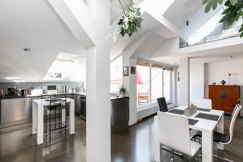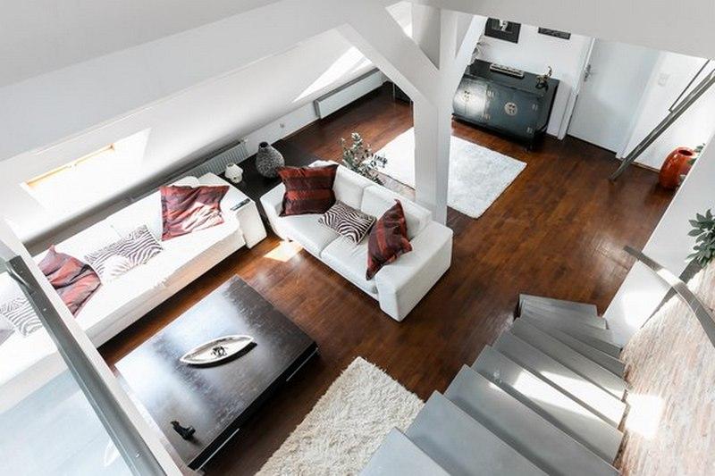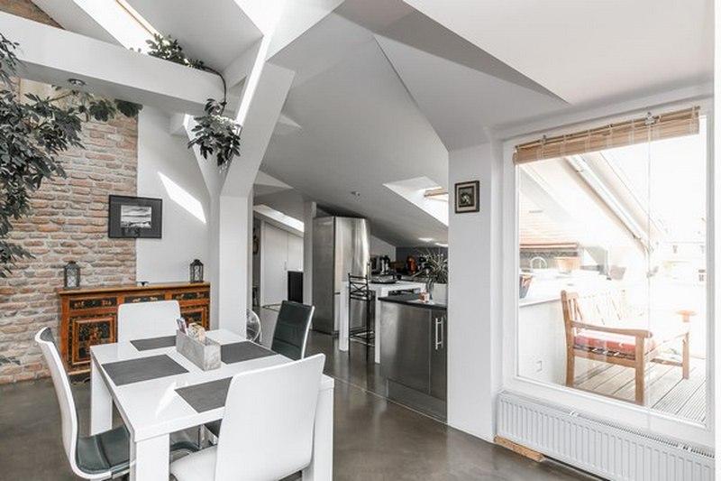 Podkrovní byt je velmi zajímavě a prakticky řešený. Skládá se z otevřeného prostoru - obývacího pokoje a kuchyně se vstupem na terasu. Kuchyně je kompletně zařízena spotřebiči. V dolní části je také manželská ložnice s prostornou šatní skříní a manželskou postelí. Terasa (cca 15m2) je situována v klidném vnitrobloku. Koupelna nabízí vanu i sprchový kout, toaletu. V horní části jsou pak dvě oddělené ložnice, které poslouží spíše pro občasné přespání nebo možné využít jako kancelář či úložný prostor. Do jedné z nich je vstup po schodech, do druhé po žebříku nainstalovaného do zdi. Komora poskytuje úložné místo, je zde pračka. Plynový kotel na vytápění.