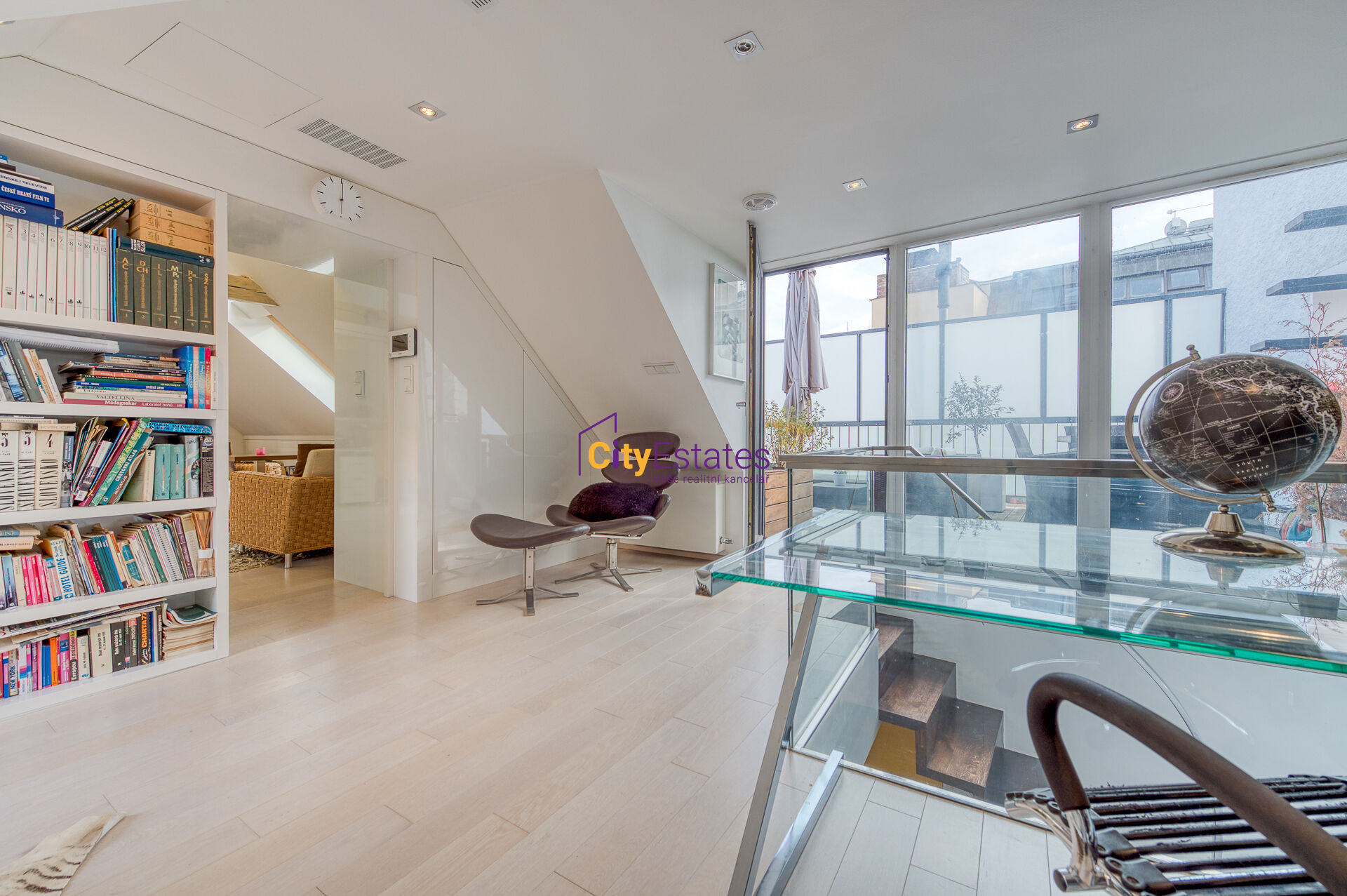 V podkrovní části bytu jsou další dva pokoje – jeden nyní slouží jako pokoj pro hosty s vlastní koupelnou, druhý jako pracovna s balkonem a vstupem na prostornou terasu s letním sezením, kamenným stolem a vzrostlou zelení. Nad touto terasou je druhá střešní terasa s panoramatickým výhledem na Staré Město, Petřín a Hradčany.