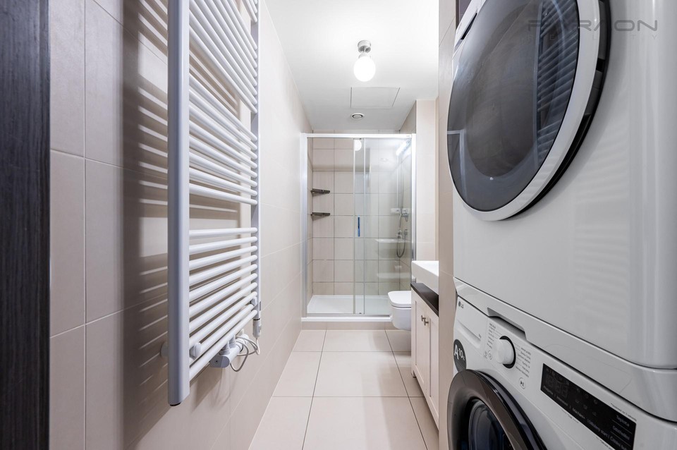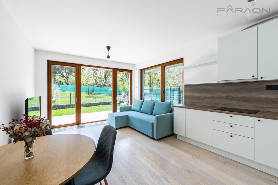 Byt má krajní, rohové umístění v rámci uzavřeného soukromého areálu a jeho jižní orientace, s výhledem k lesu, nabízí maximální soukromí. Na předzahrádku s terasou a praktickým zahradním domkem je možné vstoupit z obou pokojů. Bezparapetová, velkoformátová okna s výhledem do zeleně dodávají bytu úžasnou zenovou atmosféru.