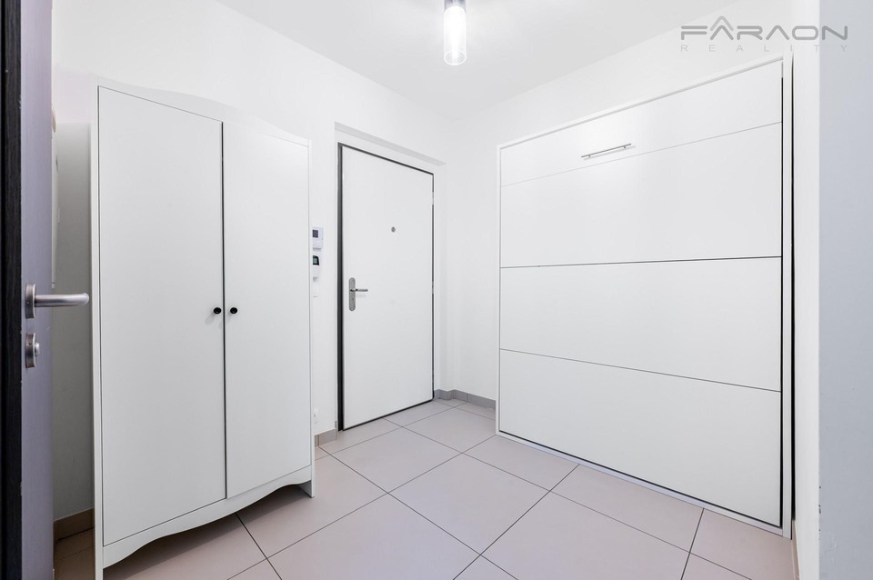 Obývací pokoj má okna do 2 stran a působí tak příjemně vzdušně. Kuchyňská linka v bílém provedení disponuje všemi spotřebiči: sklokeramická deska, digestoř, trouba, myčka a samostatně stojící lednice. V ložnici / dětském pokoji jsou vestavěné úložné prostory. Koupelna má sprchový kout, toaletu, umyvadlo a místo pro pračku se sušičkou. Předsíň je dostatečně prostorná i pro důvtipné řešení sklápěcí postele pro hosty. Dřevěná okna Vekra, s izolačními dvojskly, jsou osazená venkovními, elektricky ovládanými žaluziemi. Podlahy jsou dřevěné - dub artic, se zapuštěným topením.