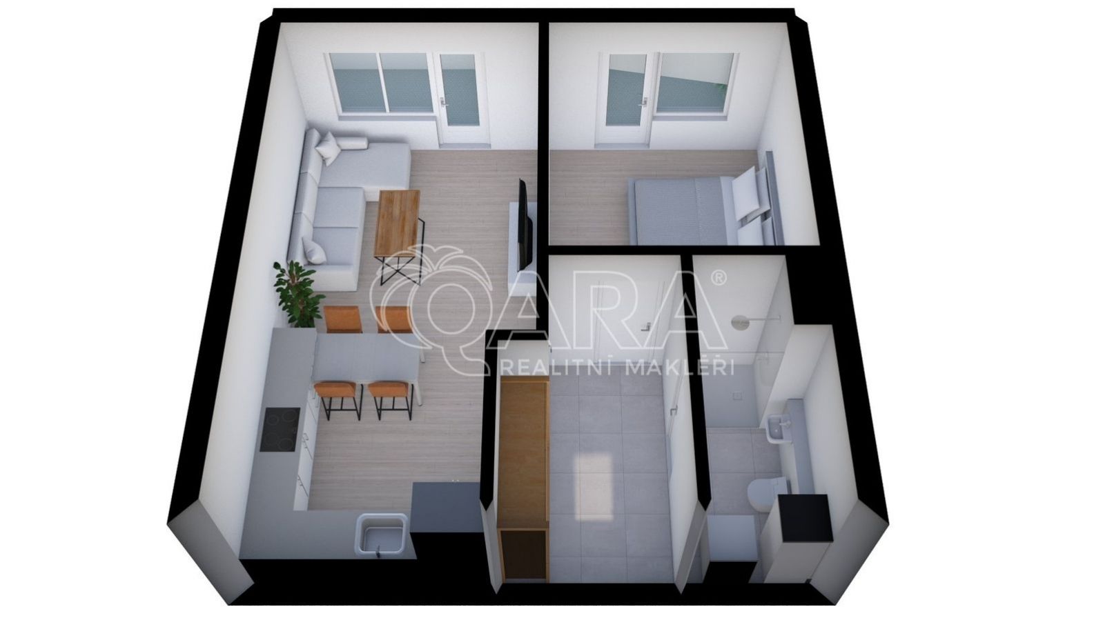Byt se nachází v tiché ulici a je orientovaný na západ. Je ve 4. patře prémiového projektu AALTO Cibulka. Má 52,6 m2 a je rozdělený na obývací pokoj s kuchyňskou linkou (25,1 m2), ložnici (13,3 m2), prostornou koupelnu s toaletou (3,9 m2), kde je místo i pro pračku, a předsíň (6,8 m2).