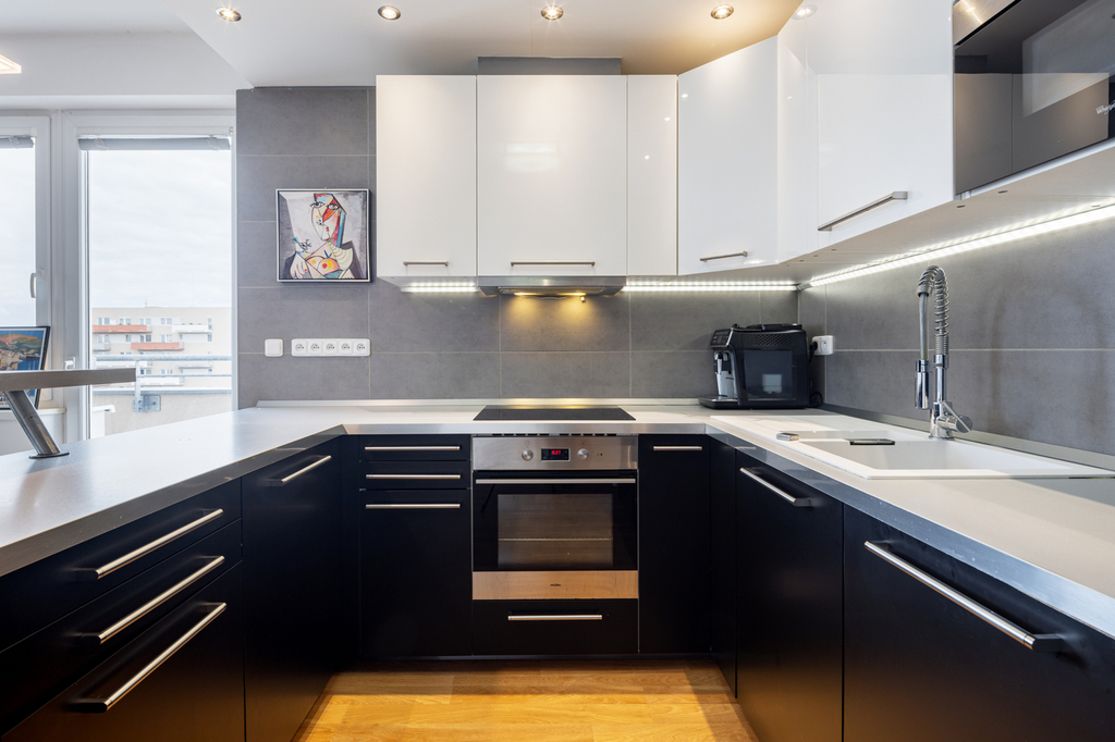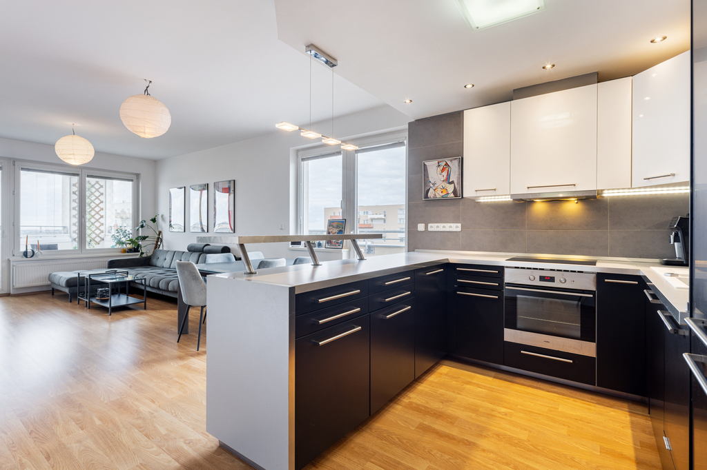 Dispozice bytu je velmi praktická a promyšlená – obytná část je zcela oddělena od části odpočinkové. Dominantou bytu je prostorný obývací pokoj s moderní kuchyňskou linkou o rozloze 36 m², který nabízí dostatek místa pro rodinný život i společné chvíle s přáteli. Z obývacího pokoje je přístup na jeden z balkónů a také na zasklenou lodžii, která je chráněna před větrem a chladem. Díky tomu se dá pohodlně využívat po celý rok – ať už k odpočinku, čtení, nebo práci.