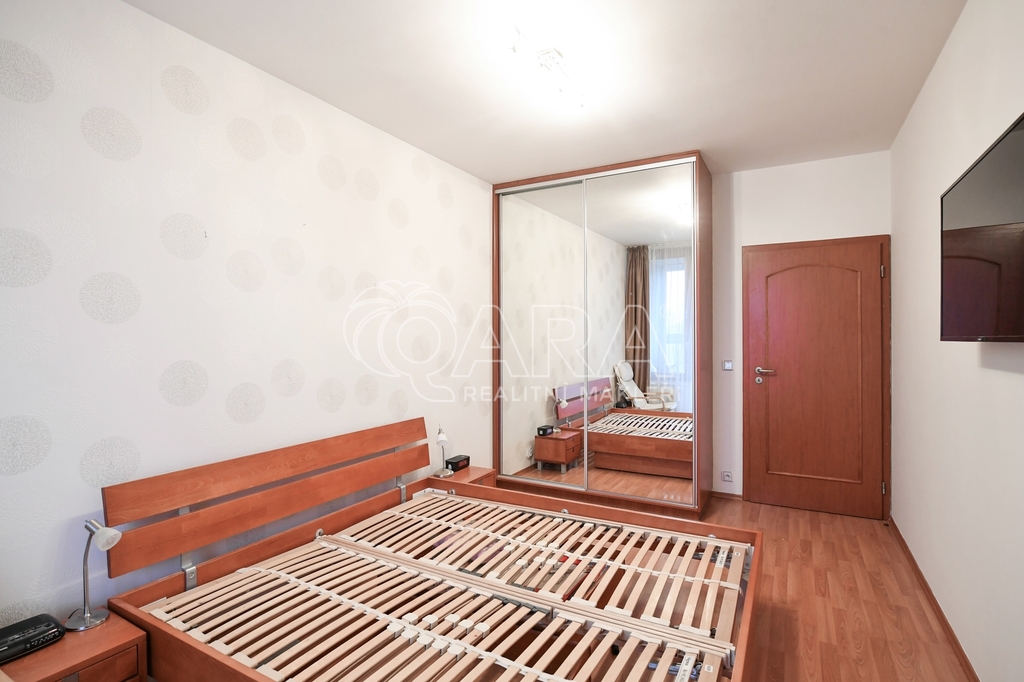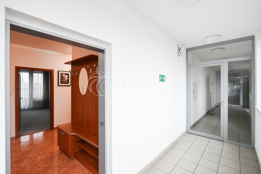Byt o celkové výměře 90,51 m² (vnitřní plocha 82,05 m 2, lodžie 8,46 m²) je velice dobře dispozičně řešen a sestává ze vstupní chodby, šatny, komory, obývacího pokoje s kuchyňským koutem, 2x ložnice, koupelny s vanou a se sprchovým koutem a samostatného WC. Z obývacího pokoje a z obou ložnic je možný vstup na lodžii, která je orientována, stejně jako všechna okna v bytě, na východ. Vytápění bytu zajišťuje centrální plynová kotelna v domě. Dům je vybaven dvěma výtahy. V domě je možnost pronájmu libovolného počtu garážových stání.