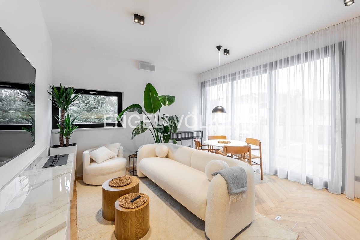 Byt je vybaven stropním vytápěním a chlazením, centrálním větráním s rekuperací, venkovními žaluziemi, dřevěnými podlahami a chytrou domácností Loxone. Součástí nájmu je kvalitní a nadstandardní vybavení bytu, včetně nové pračky a sušičky značky Miele, masivní postele a televize.