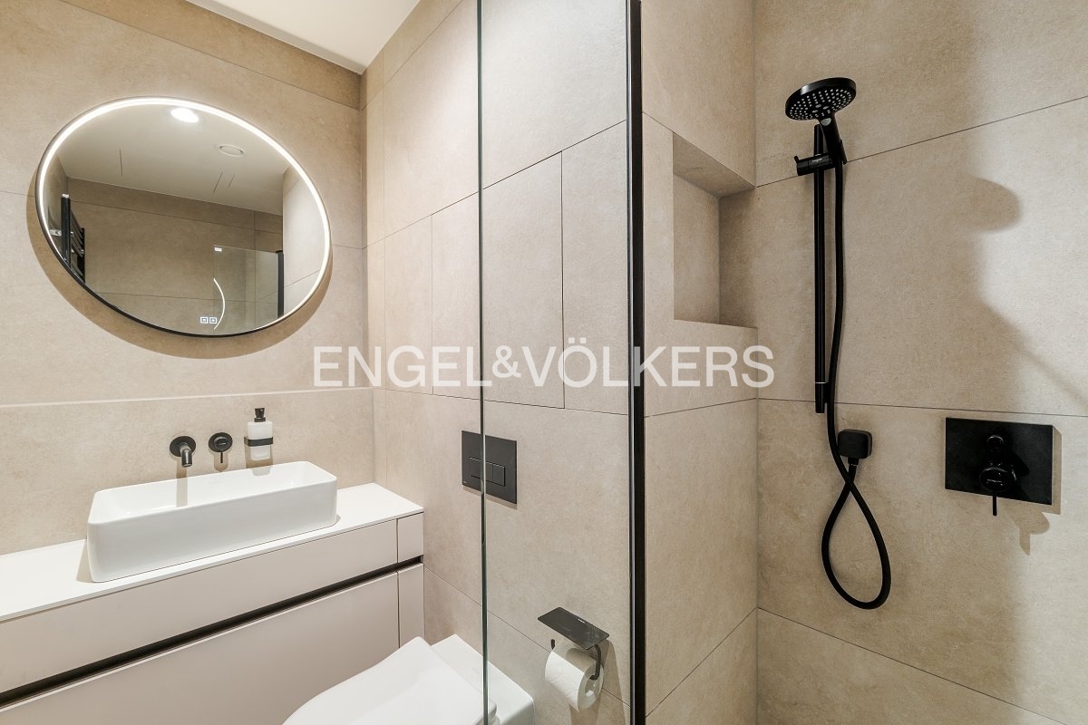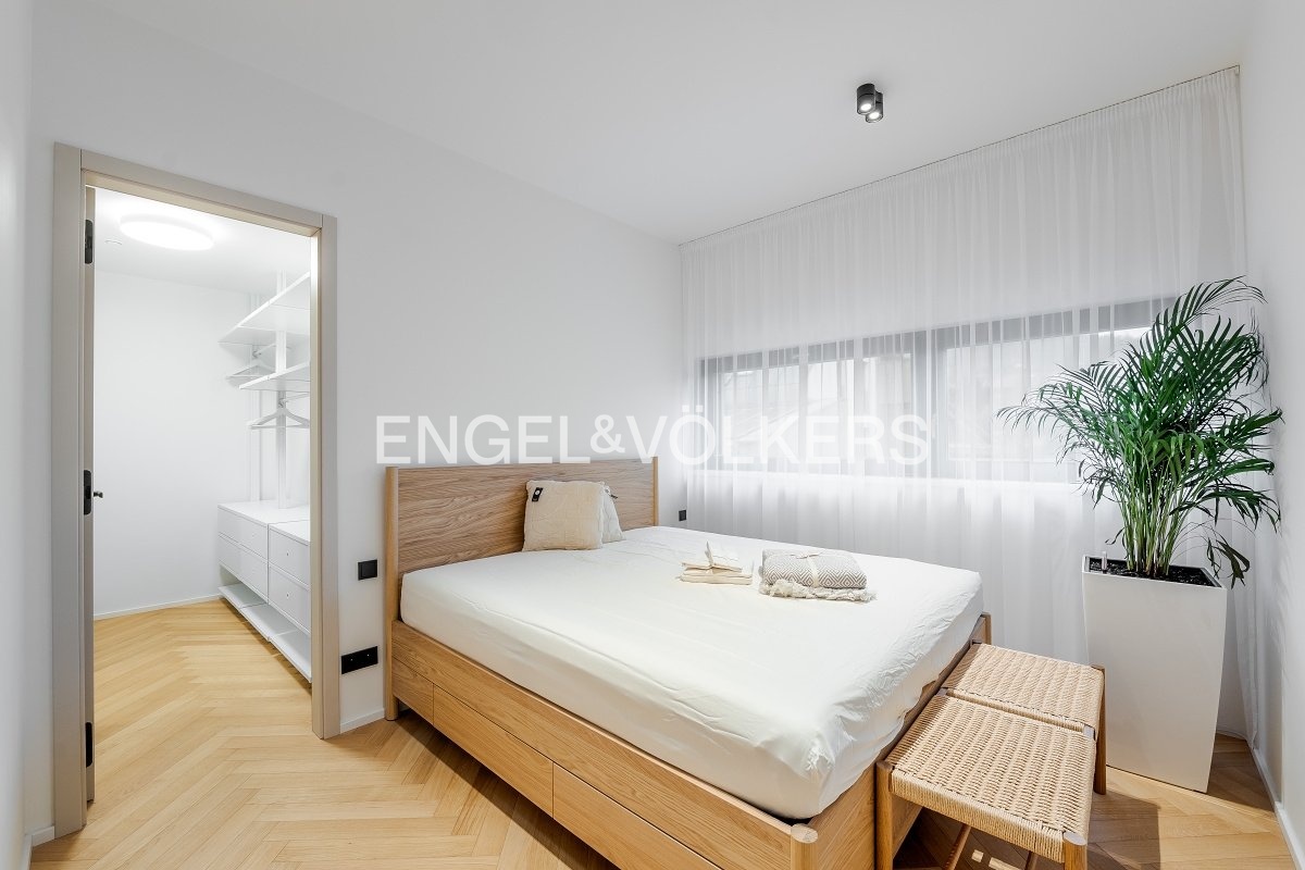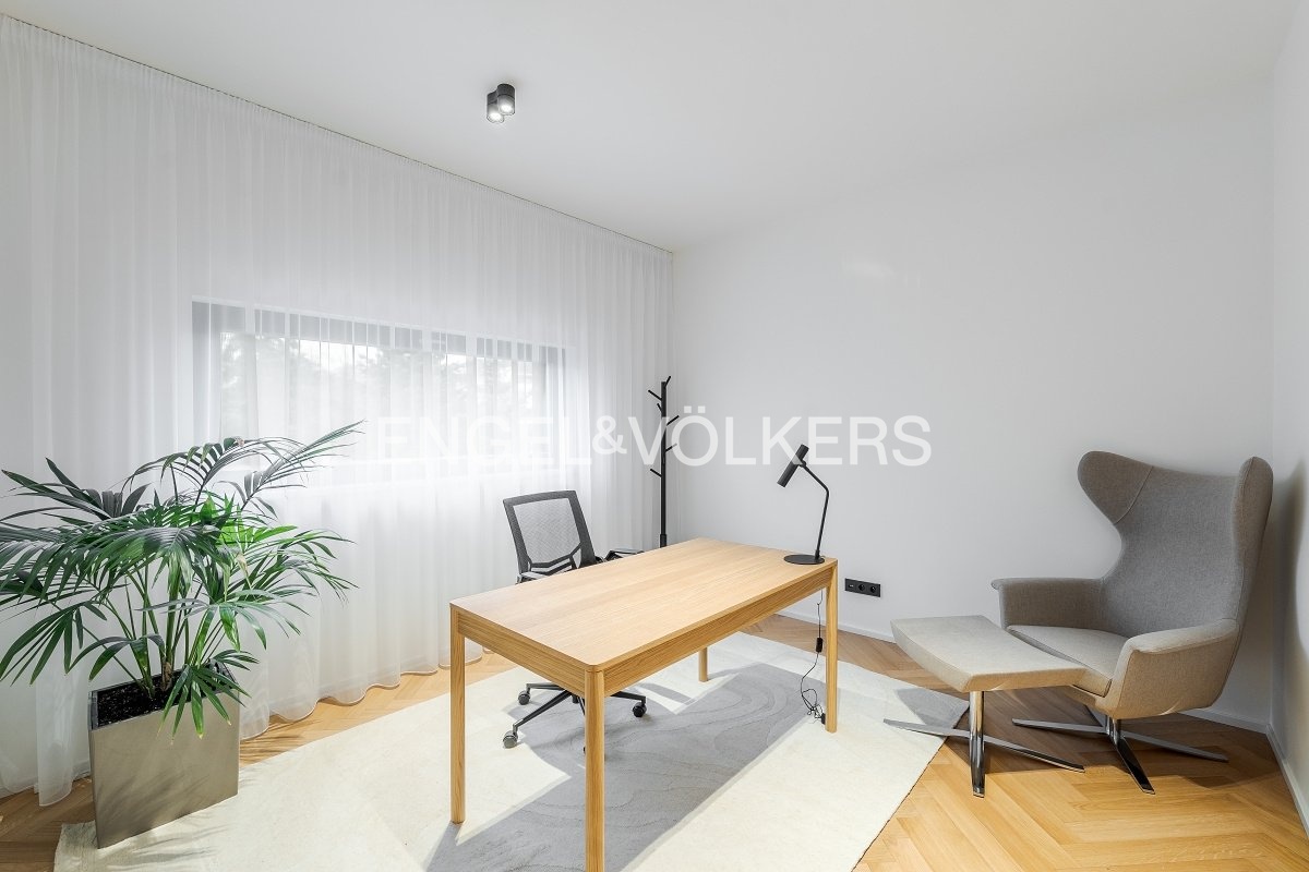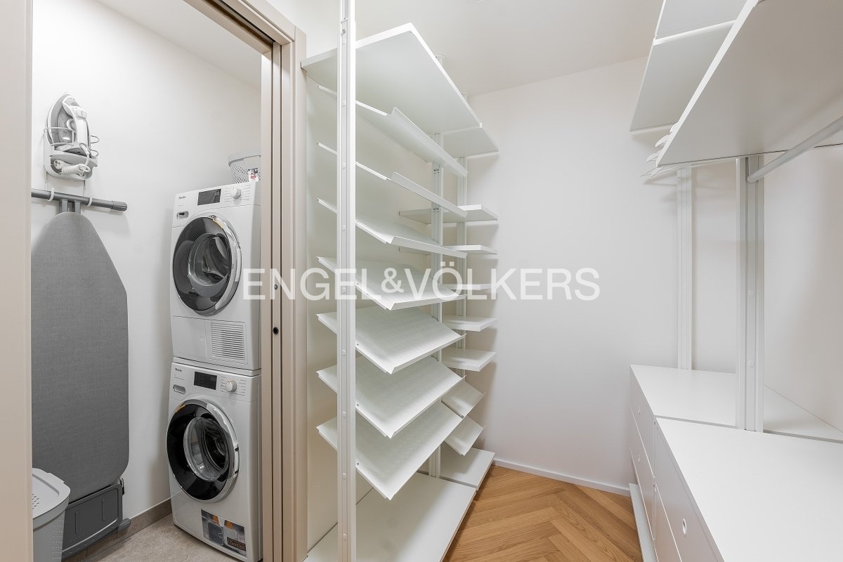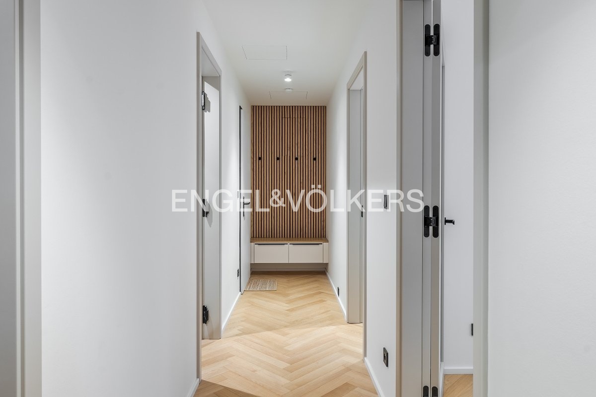 Dispozice zahrnuje světlý obývací pokoj s jižní orientací a luxusní kuchyňskou linkou na míru se spotřebiči Miele včetně vinotéky, hlavní ložnici s prostornou šatnou a vlastní prádelnou, druhou ložnici vhodnou také jako pracovnu či pokoj pro hosty a dvě velké koupelny – jedna s vanou a sprchou, druhá s prostorným sprchovým koutem.