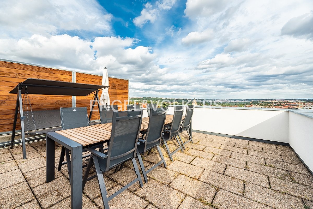 Z obývacího pokoje je přístup na zahradu s terasou. Zahrada je vybavena bezúdržbovým systémem. V prvním patře se nacházejí 3 samostatné ložnice – hostinský pokoj, dětský pokoj a manželská ložnice – společně se dvěma koupelnami. Na chodbě v tomto patře jsou vestavěné skříně. V posledním patře se nachází samostatná ložnice, která může sloužit také jako pracovna, s další koupelnou. Z této ložnice je přístup na prostornou terasu s nábytkem a úžasným výhledem na Pražský hrad a Tróju.