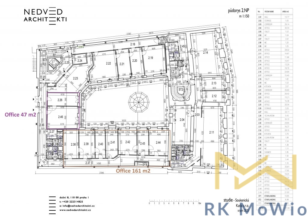 Nabízíme k pronájmu klimatizovanou kancelář o velikosti 161 m², umístěnou v 1. patře (2. nadzemní podlaží) moderní administrativní budovy, v ulici Soukenická na Praze 1 – Nové Město. Budova disponuje reprezentativními společnými prostory, recepcí, ostrahou 24/7, rychlým internetem s optickým připojením, parkingem, výtahy a výbornou dostupností. Společné prostory disponují toaletami a tichými terasami ve vnitrobloku k vybraným jednotkám. Možnost pronajmout až 4 parkovací stání za extra poplatek. Kancelářské prostory je možné upravit dle požadavků nájemce s ohledem na stanovený rozpočet majitele.