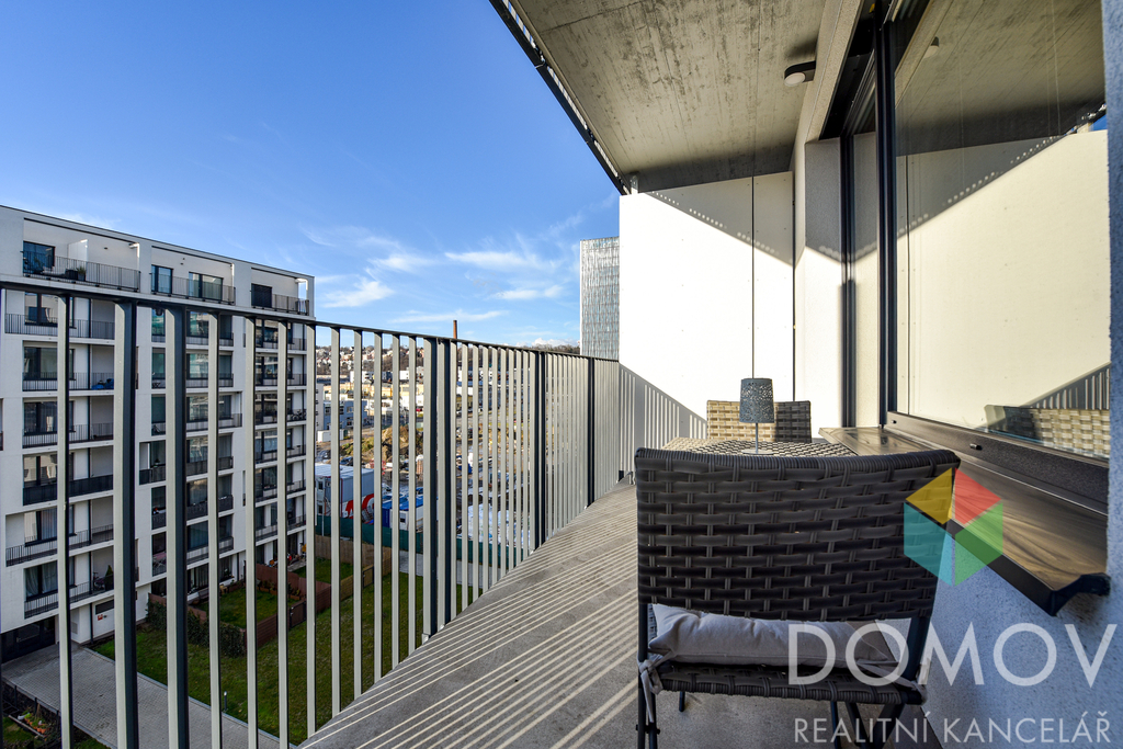 Byt se nachází v 6. patře a z balkónu je výhled do nádvoří tvořeného novými domy. Je zařízen ve vysokém standardu a jeho velkým benefitem je množství úložných prostor. V kuchyňské lince je lednice s mrazákem, indukční varná deska, el. trouba, mikrovlnná trouba, dřez, digestoř. Na podlahách je velmi příjemná dřevěná plovoucí podlaha. Je zde také menší jídelní stůl se dvěma židlemi a postel. V koupelně sprchový kout, umyvadlo, závěsné WC a pračka. V předsíni jsou po celé délce zdi vestavěné skříně, botník, věšáky.
