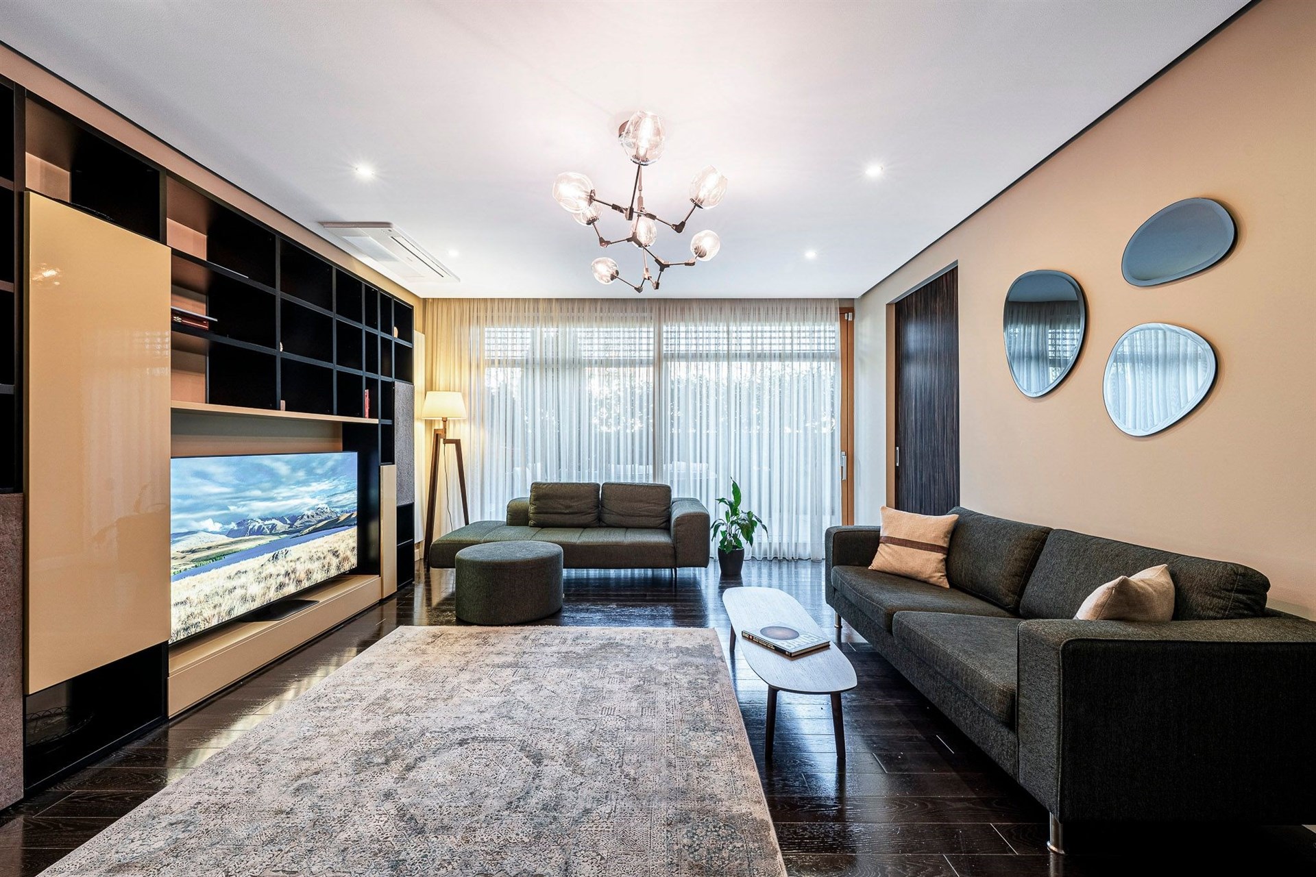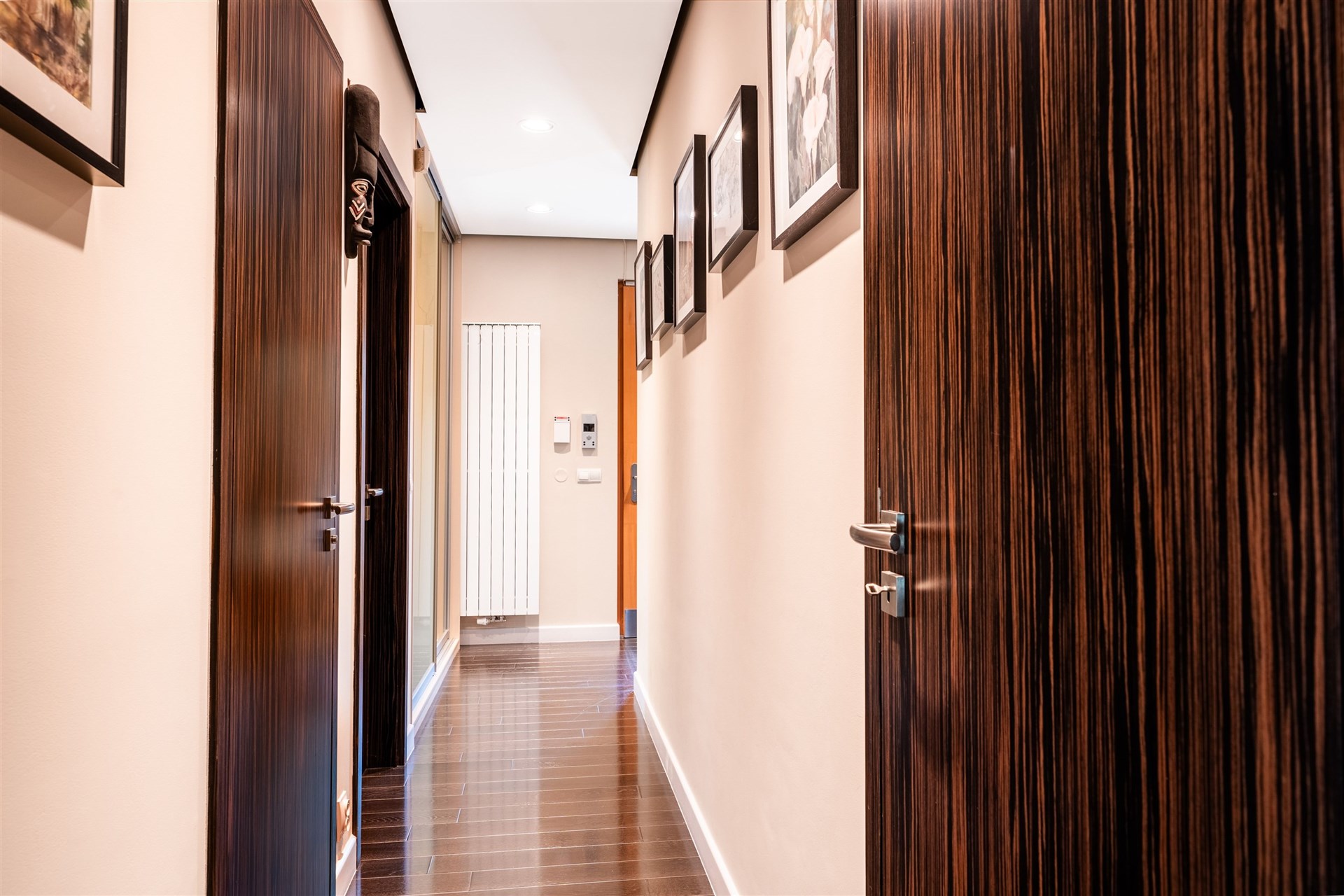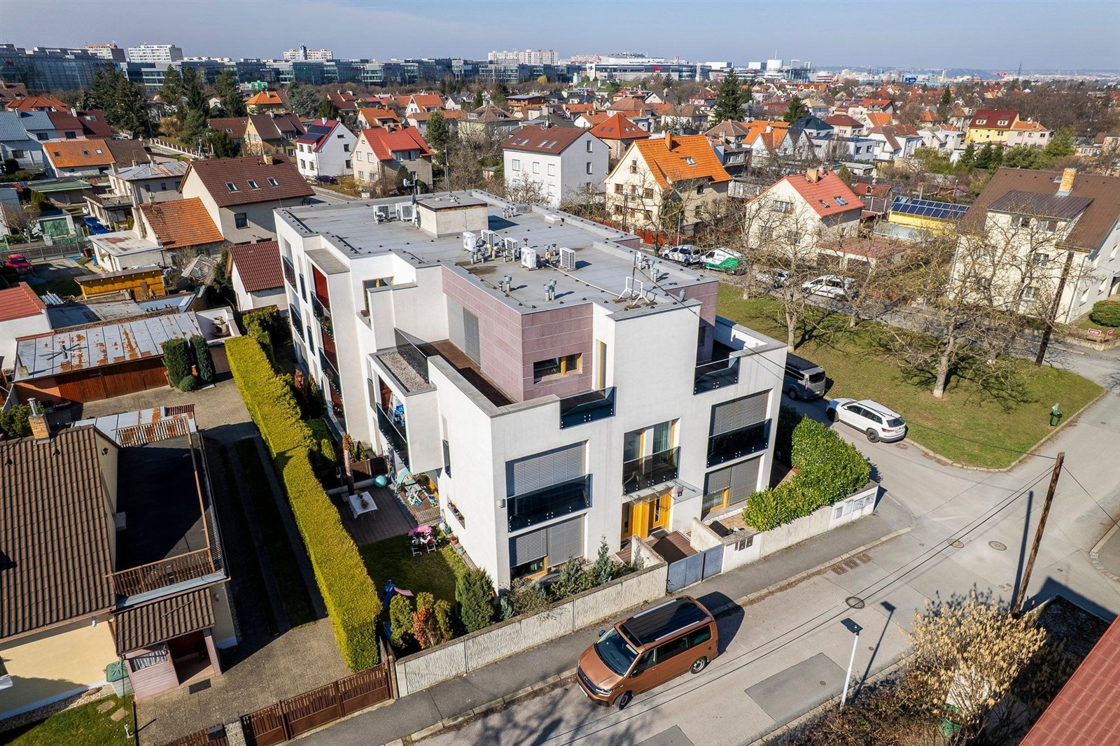 Jeho dispozice zahrnuje tři ložnice, z nichž každá má vlastní koupelnu, prostorný obývací pokoj propojený s plně vybavenou a moderní kuchyní, samostatnou toaletu, chodby a šatnu. Kuchyň je vybavena moderními spotřebiči, jako je varná deska, vestavěná lednice s mrazákem, mikrovlnná trouba, elektrická trouba a myčka nádobí. Obývací pokoj je prostorný, s přímým vstupem na zahradu s terasou o ploše 70 m², která poskytuje ideální místo pro trávení společných chvil na čerstvém vzduchu. Ložnice v posledním podlaží navíc disponuje terasou o velikosti 25,5 m², která nabízí nádherný výhled do sousedního parku. Byt dále disponuje uzavřenou lodžií (6,7 m²) a sklepem (4 m²). Součástí bytu jsou také dvě parkovací stání v garáži.