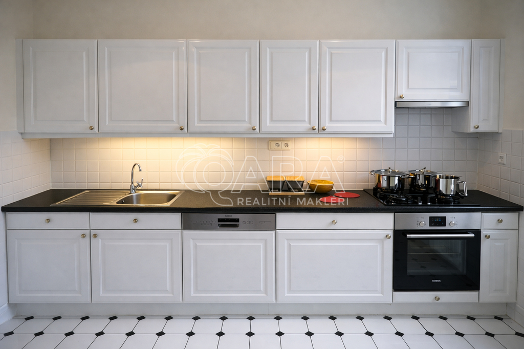 Dispozice bytu zahrnuje prostornou vstupní halu, reprezentativní obývací pokoj, tři samostatné pokoje, komoru, koupelnu s vanou, toaletou a bidetem a samostatnou toaletu. Oddělená kuchyně je vybavena novou moderní kuchyňskou linkou se všemi spotřebiči (sporák, trouba, lednice s mrazákem, myčka, pračka).