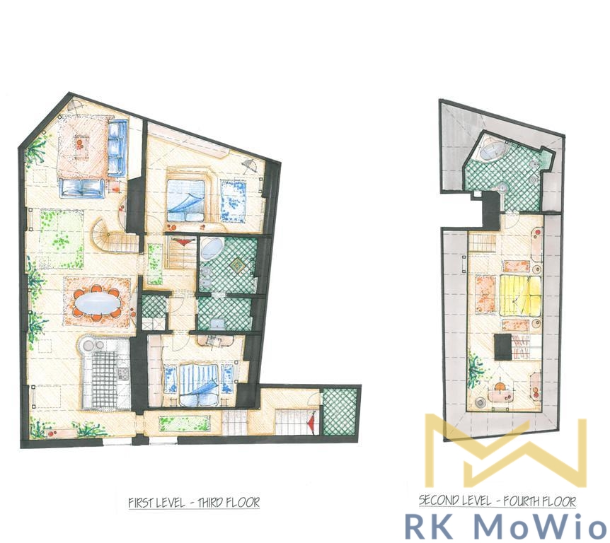 Půdorys spodního patra bytové jednotky nabízí vstupní chodbu, vzdušný obývací pokoj s jídelní částí, kuchyňský kout, 2 ložnice, 1 koupelnu (s vanou, umyvadlem, bidetem a toaletou) a 2 komory. Z obývacího pokoje vede schodiště do horního patra a naleznete zde hlavní ložnici s privátní koupelnou (s vanou, umyvadlem, bidetem a toaletou). Vybavení bytu: kuchyňská linka včetně sklokeramické varné desky, digestoře, myčky, elektrické trouby; vestavěné skříně, přípojka pro pračku a sušičku, příprava pro vysokorychlostní internet, dřevěné podlahy a dlažba.