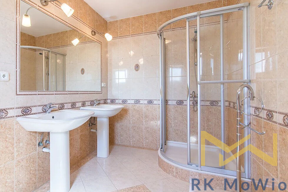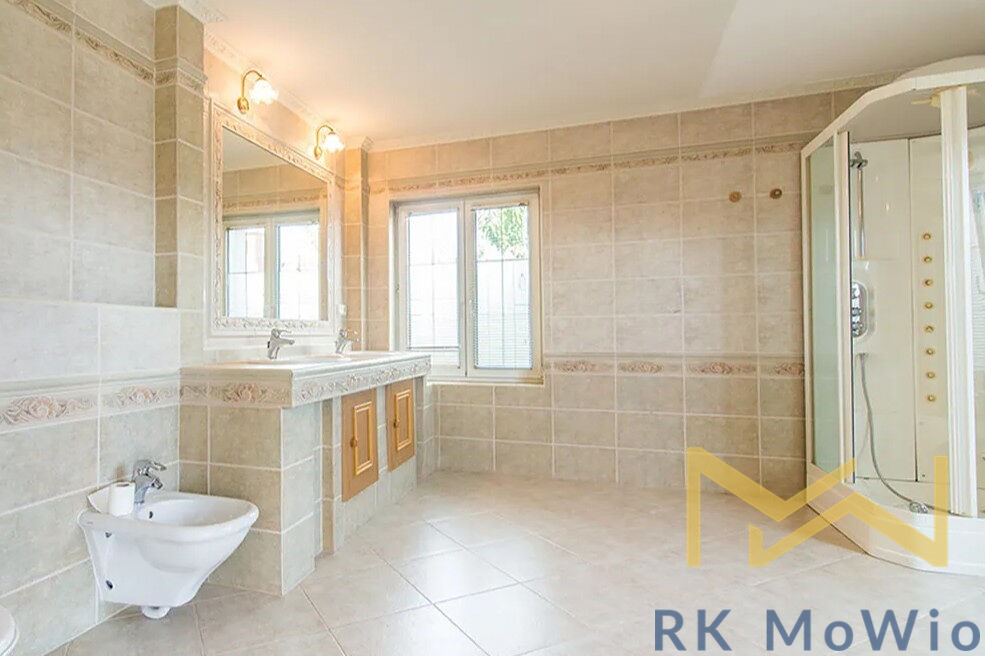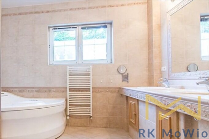 Přízemí domu disponuje vstupní halou, prostorným obývacím pokojem s arkýřem a krbem, oddělenou kuchyni a jídelnu, hlavní ložnici, 1 koupelnu (s rohovou vanou, dvěma umyvadly, bidetem a toaletou) a toaletu pro hosty. V 1. patře naleznete galerii, 4 ložnice, 2 koupelny (1x se sprchou a umyvadlem, 1x se sprchou, dvěma umyvadly, bidetem a toaletou), šatnu, další extra toaletu a balkón. V suterénu se nachází 1 multifunkční pokoj, prádelna a technická místnost. Vybavení domu: kuchyňská linka (včetně lednice s mrazákem, plynové varné desky, digestoře, myčky, zabudované elektrické a mikrovlnné trouby), vestavěné skříně, plynový kotel, přípojka pro pračku a sušičku, alarm, dřevěné podlahy a dlažba. K dispozici jsou také 2 parkovací stání v garáži a další parkování na pozemku.
