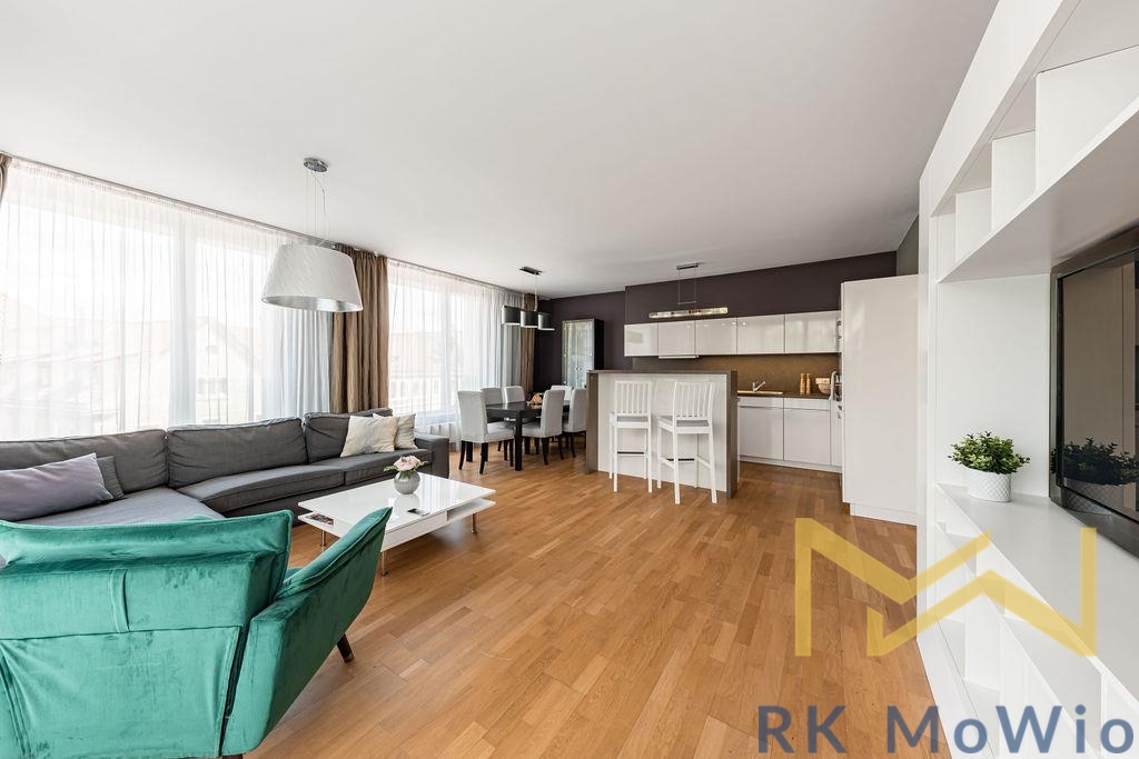 Půdorys bytové jednotky disponuje vstupní chodbou, vzdušným obývacím pokojem s přístupem na terasu, kuchyňským koutem s jídelním prostorem, hlavní ložnicí s vlastní koupelnou (se sprchou, umyvadlem a toaletou), dvěma ložnicemi, oddělenou koupelnou (s vanou a dvěma umyvadly) a praktickou samostatnou toaletou. Další vybavení bytu: kvalitní kuchyňská linka včetně lednice s mrazákem, sklokeramické varné desky, digestoře, elektrické trouby a myčky, vinotéka; vestavěné skříně, pračka, možnost instalace sušičky, příprava pro vysokorychlostní internet, dřevěné podlahy a dlažba. Součástí pronájmu je 1 sklep, možnost pronájmu parkovacího stání za extra poplatek 3.600,- Kč/měsíc. K dispozici 1.3.2026.