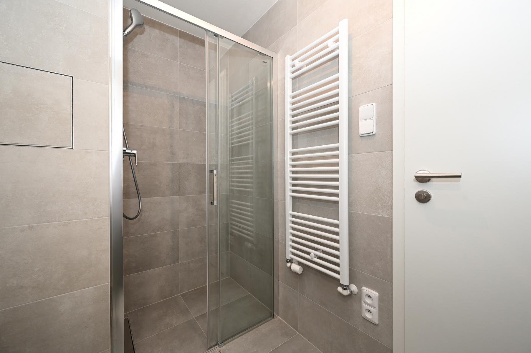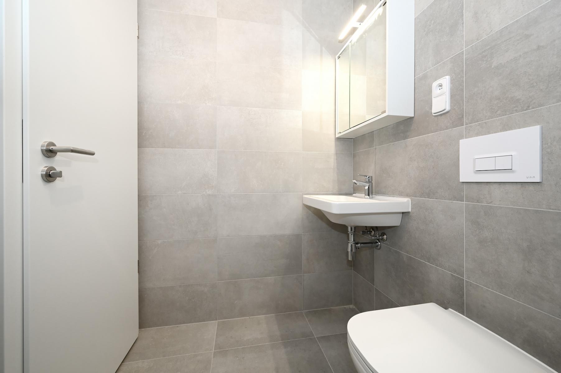Koupelna nabízí sprchový kout, závěsné WC a umyvadlo se skříňkou a působí velmi čistým a moderním dojmem.