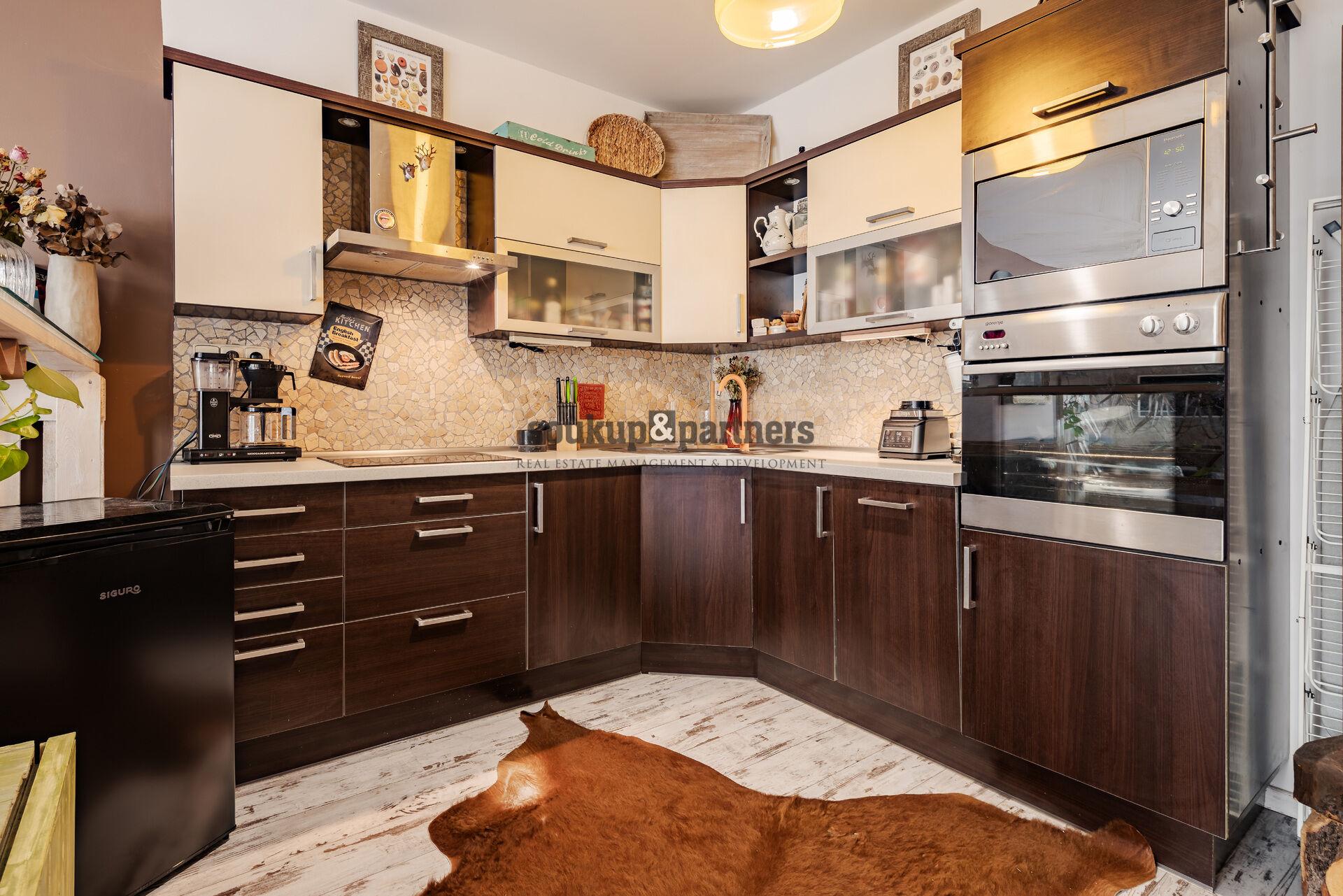 – plně vybavená kuchyň (myčka, lednice, mrazák, indukční varná deska, digestoř, el. trouba, mikrovlnná trouba)