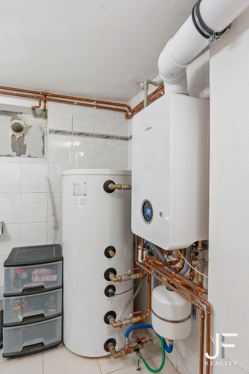 V suterénu domu je obytné zázemí pro správce, kotelna a může zde být dostatek skladovacích prostor pro obyvatele domu, nájemce či majitele.