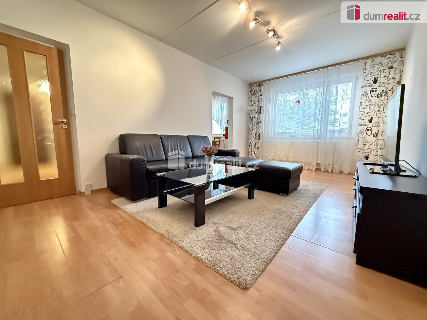 Obývací pokoj je zařízen sedací soupravou, konferenčním stolkem a TV se skříňkou. K bytu náleží také sklepní kóje.