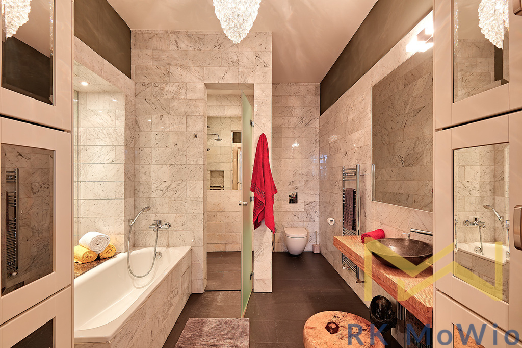 Půdorys bytové jednotky disponuje vstupní chodbou, velkorysým obývacím pokojem propojeným s jídelním prostorem a kuchyní, třemi samostatnými ložnicemi, 2 koupelnami (vana, sprcha, umyvadlo, toaleta), samostatnou toaletou a balkónem. Vybavení bytu tvoří chytré spotřebiče a kvalitní materiály, včetně mramoru, vysoce jakostního dřeva a luxusních keramických prvků, které podtrhují reprezentativní charakter interiéru.