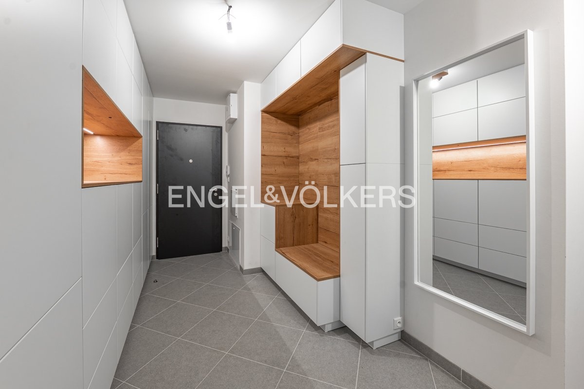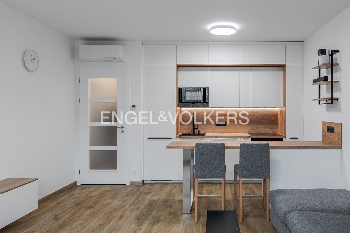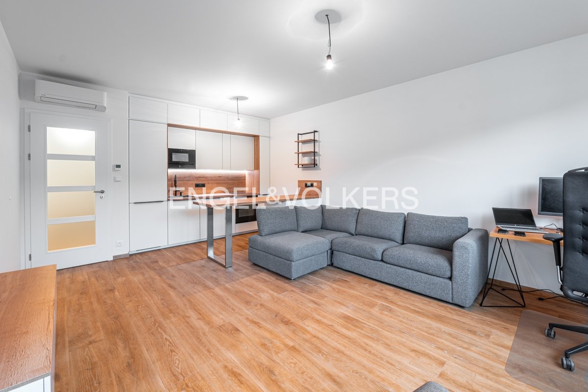 Nový a plně vybavený byt 2+kk ve vysokém standardu se nachází ve čtvrtém patře nové residence U Sluncové. Byt se skládá ze vstupní chodby s kvalitními vestavěnými úložnými prostory na míru, ze které se vchází do koupelny s vanou a pračkou, do obývacího pokoje s kuchyní plně vybavenou spotřebiči Bosch a do ložnice s luxusní postelí. Oba tyto pokoje mají přístup na lodžii s výhledem do zeleně. Byt je ideální i pro home office, jelikož nabízí pracovní kout s nastavitelným pracovním stolem, který bude oddělen od obývacího pokoje zástěnou. Předností je klimatizace ve všech pokojích a prostorné parkovací místo v podzemních garážích a sklepní prostor.