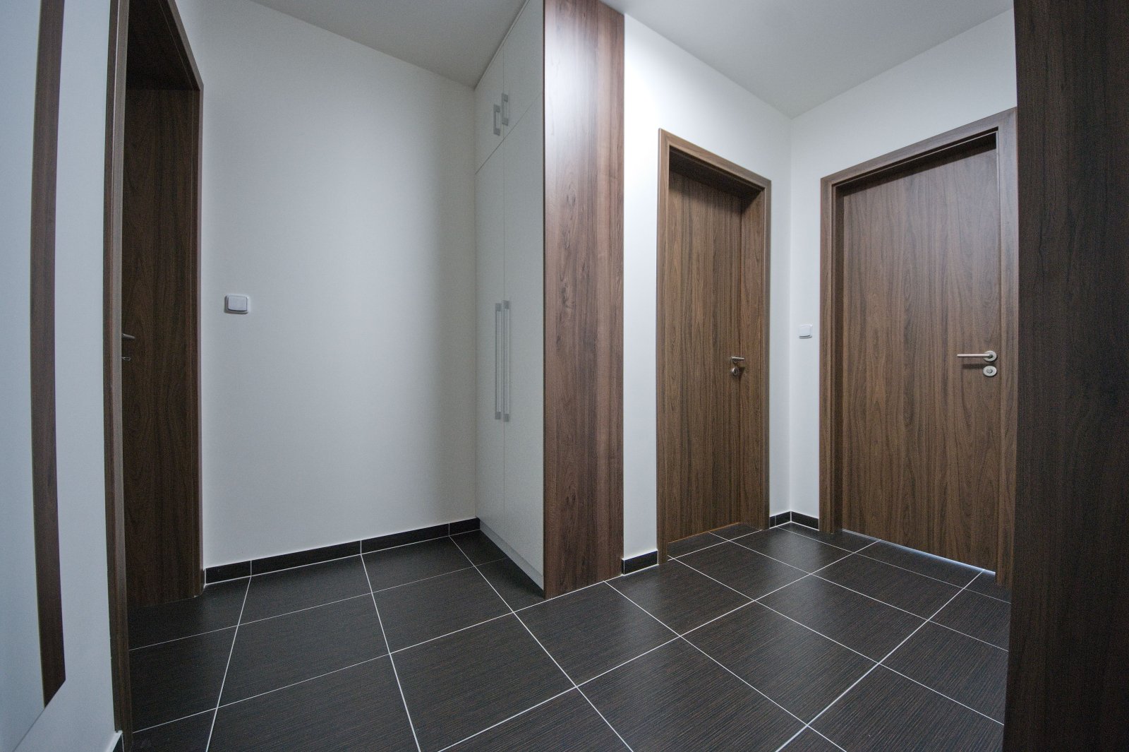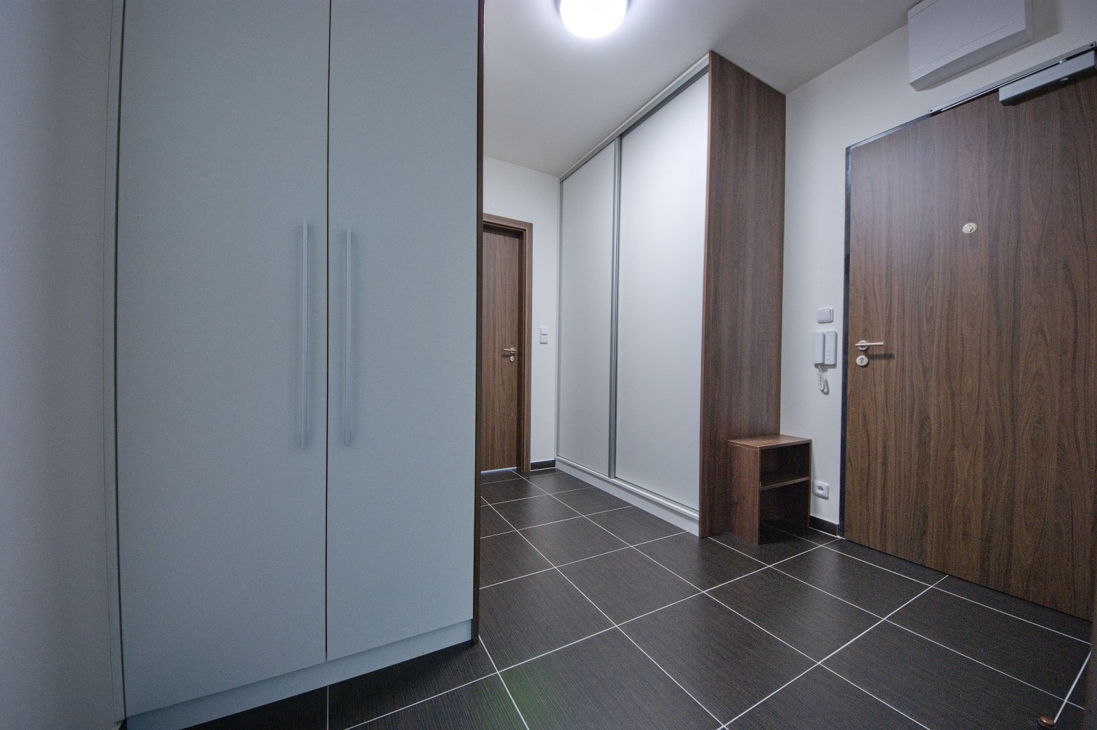 Velké vestavěné šatní skříně, věšáky a botník v předsíni. Kuchyňská linka s vestavěnou indukční deskou, horkovzdušnou troubou, myčkou a digestoří s odtahem a lednicí s mrazákem.