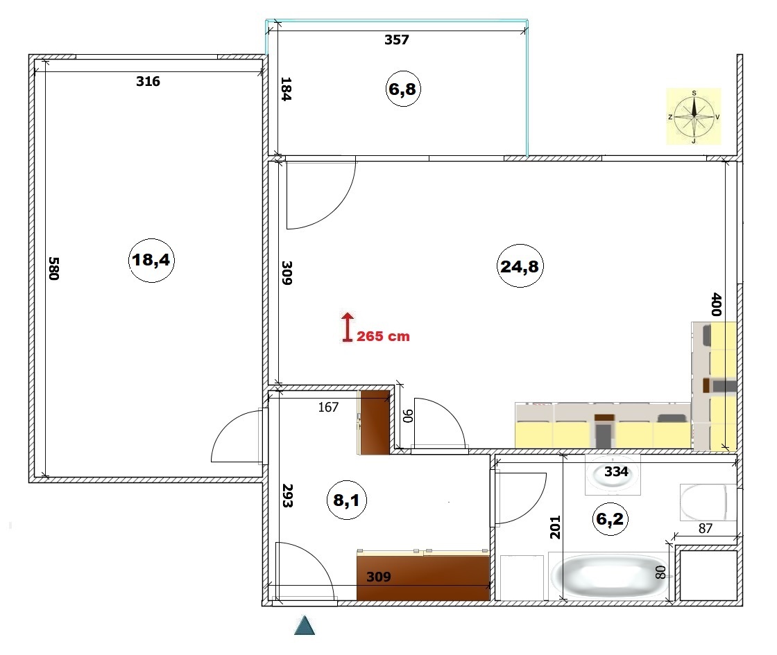 V obývacím pokoji 4 okna včetně francouzského se vstupem na terasu. Orientace oken do volného prostoru bez zástavby! Velmi prostorná koupelna s oknem, vanou, závěsným WC a pračkou. Na podlahách dlažba, vinyl a koberec. Vytápění dálkové - měřič vstupního tepla do bytu. Stropy vysoké 265 cm.