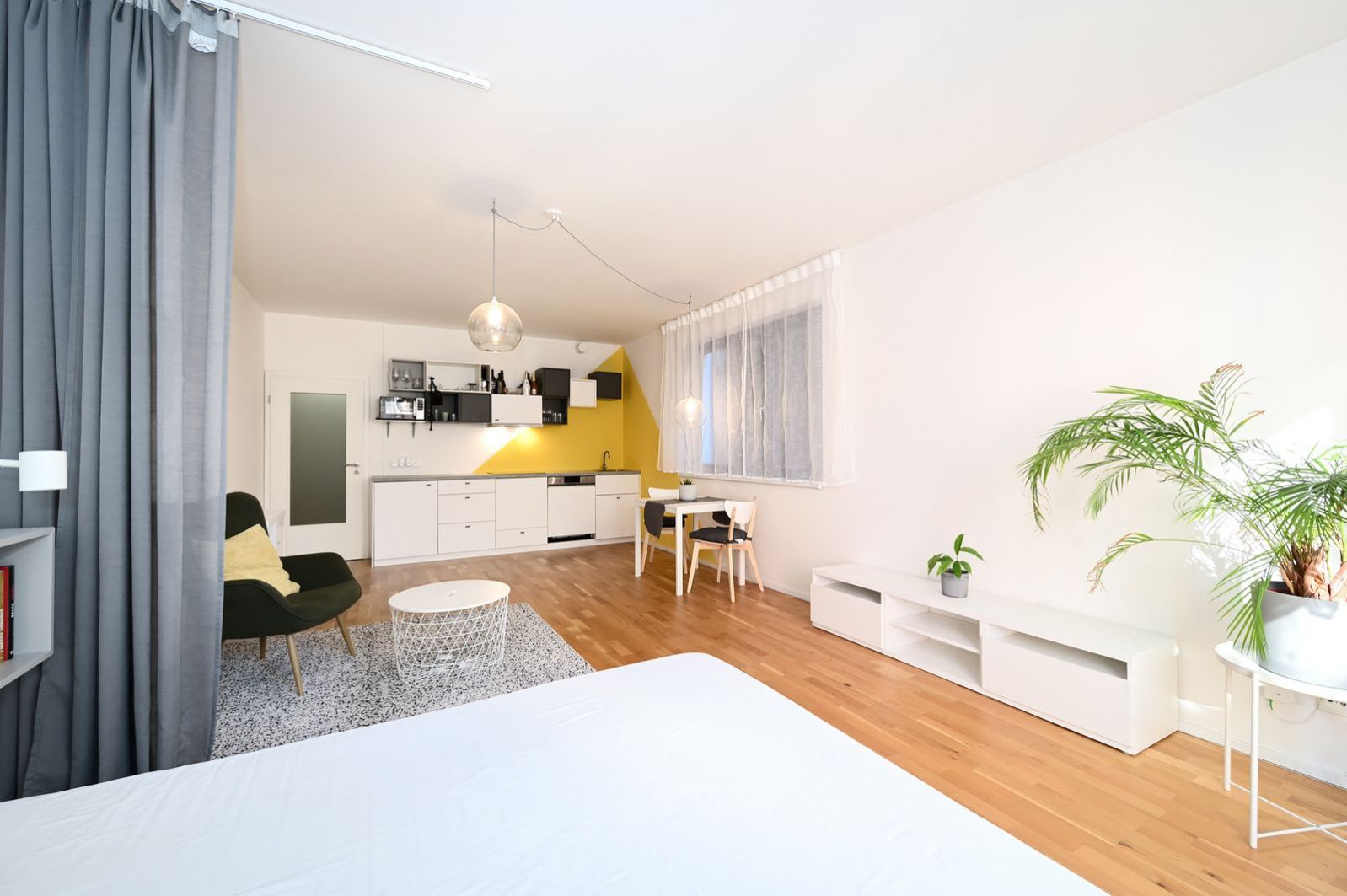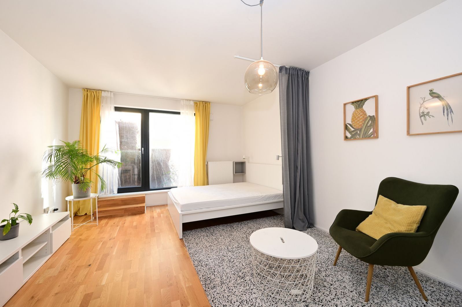 Spací část s postelí je možné opticky oddělit závěsem, pokud si budete chtít vytvořit více soukromí. Vedle postele je zároveň dostatek prostoru i pro pracovní stůl, což umožňuje pohodlné zřízení pracovního koutku pro práci z domova.