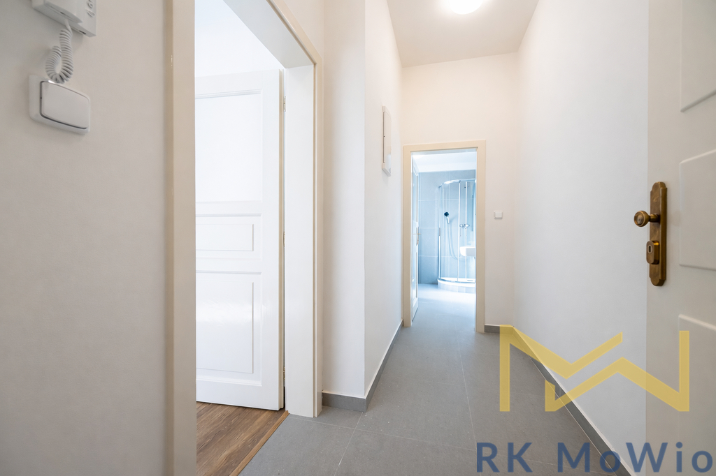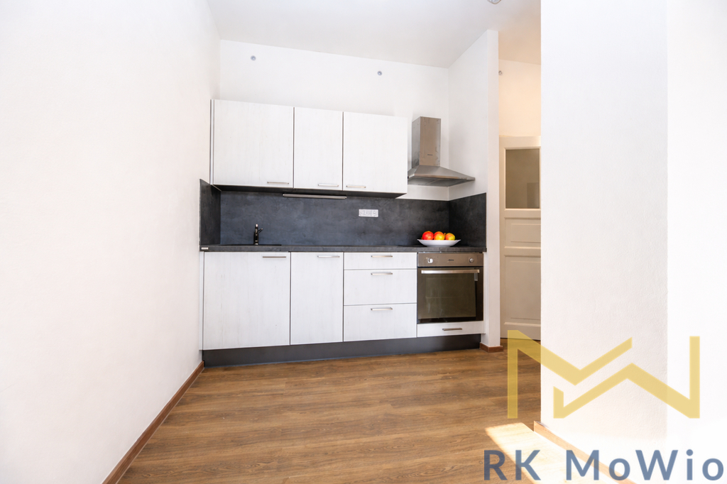 Půdorys bytové jednotky tvoří vstupní prostor, otevřený obytný pokoj s kuchyňským koutem a ložnicovým prostorem a koupelna (sprchový kout, umyvadlo, toaleta). Kuchyňská linka je vybavena spotřebiči (sklokeramická varná deska, elektrická trouba, myčka, lednice, digestoř). Byt prošel kompletní rekonstrukcí a nabízí příjemné a vzdušné prostředí. Součástí jsou plovoucí podlahy a dlažba, vytápění zajišťuje vlastní plynový kotel.