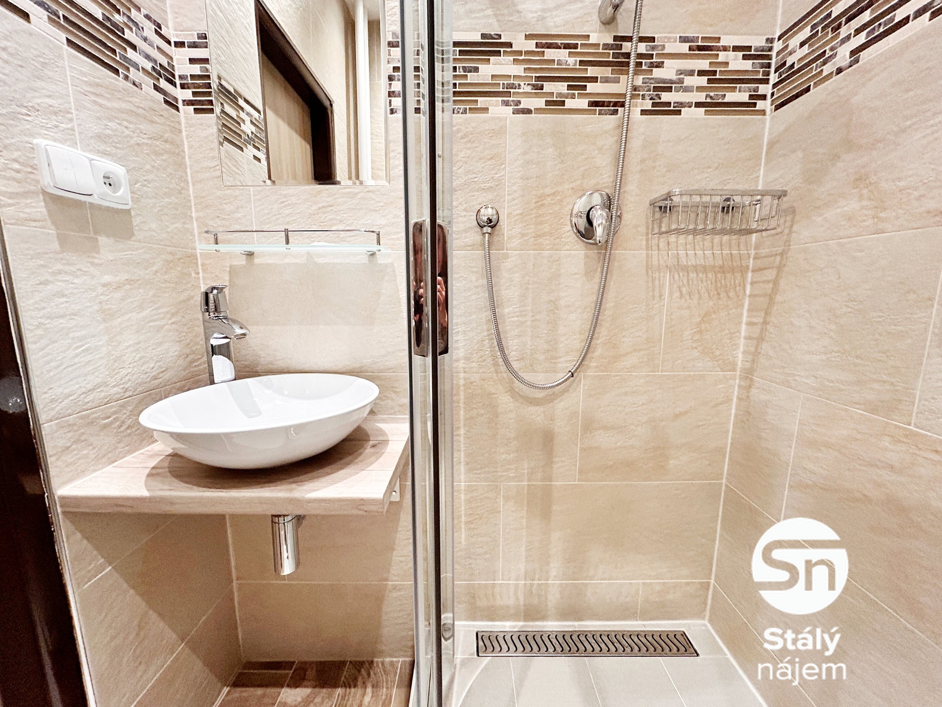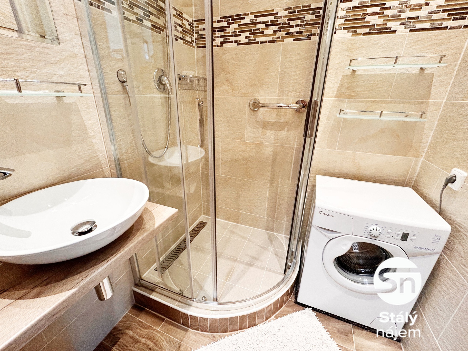 Koupelna po rekonstrukci nabízí sprchový kout se zástěnou, žebříkové topení, umyvadlo se zrcadlem, skleněné poličky a pračku. Toaleta je samostatná a má bodové osvětlení, větrák, zvýšený záchod a madlo.