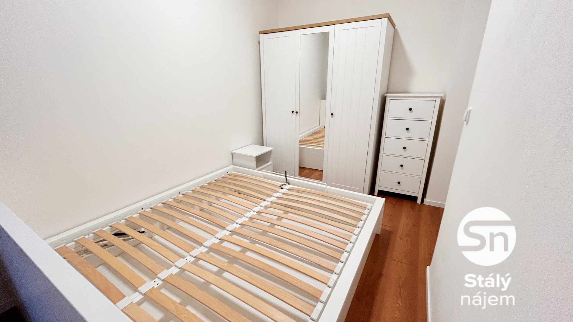 V ložnici je postel s úložným prostorem, noční stolek, prostorná skříň a komoda.