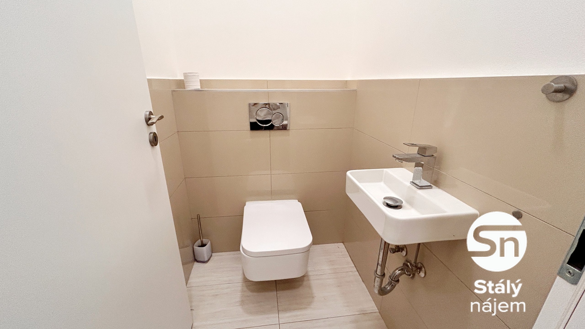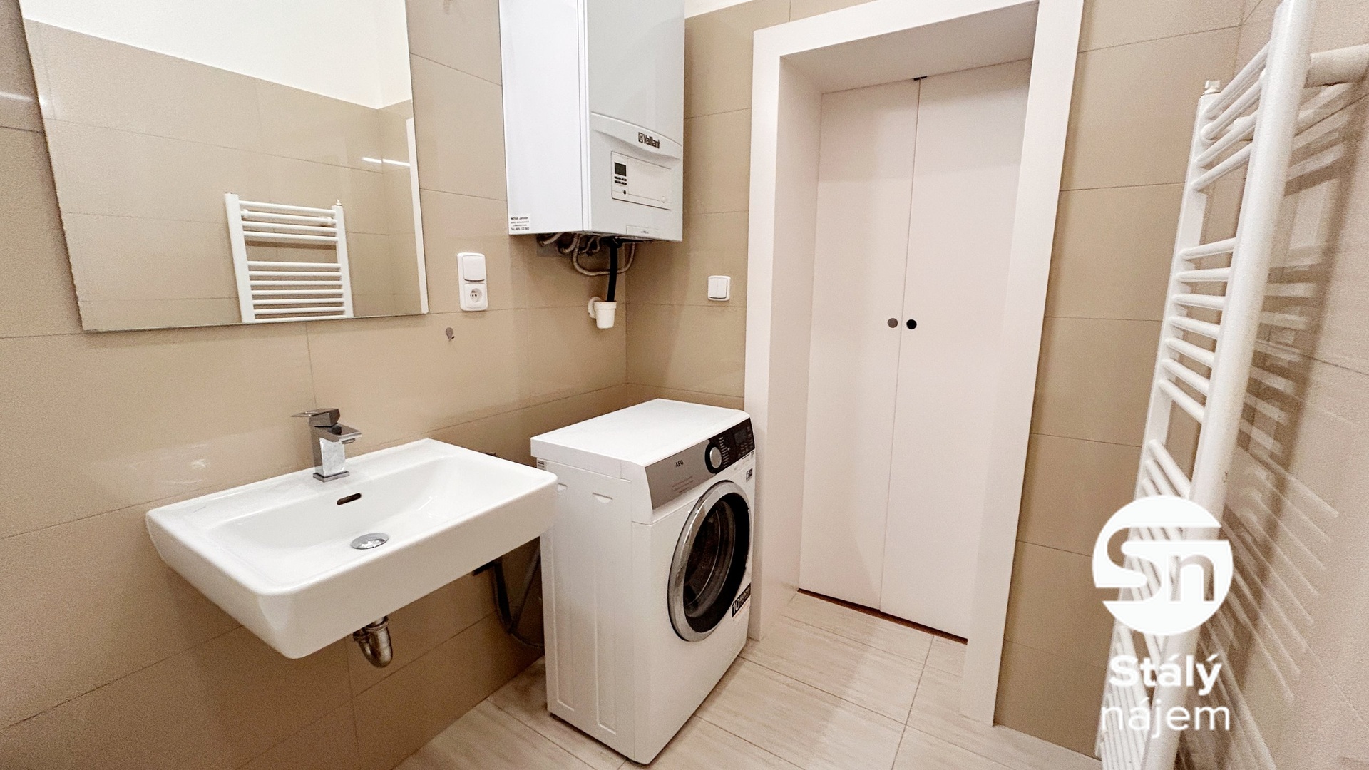 Koupelna je vybavena vanou se sprchovou hadicí, umyvadlem se skříňkou a osvětlením nad zrcadlem, pračkou, topným žebříkem a plynovým kotlem. Toaleta je samostatná, se závěsným WC a umyvadlem. Ve vstupní chodbě jsou věšáky a modem k internetu.