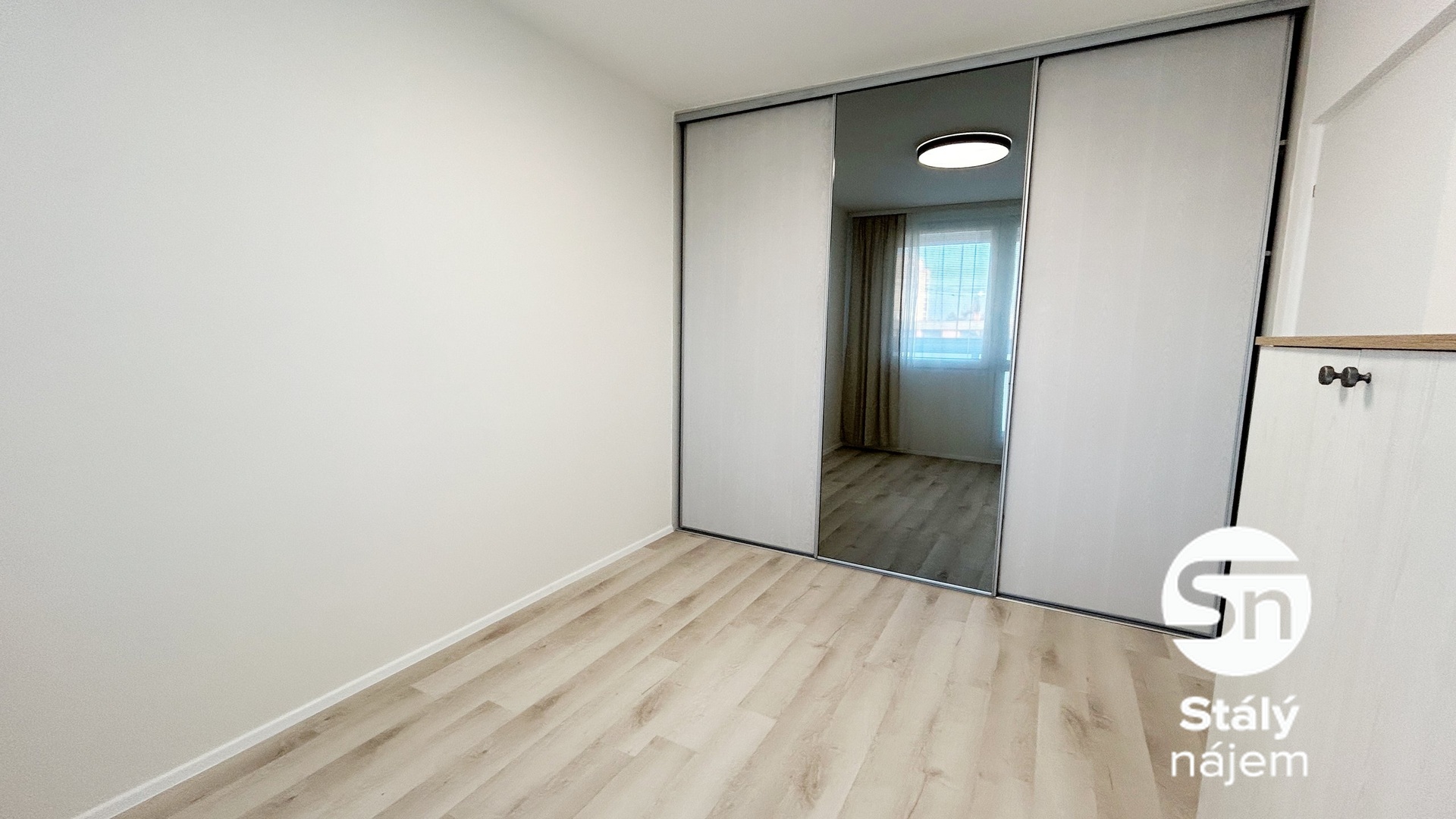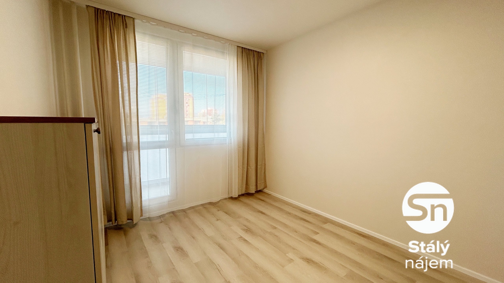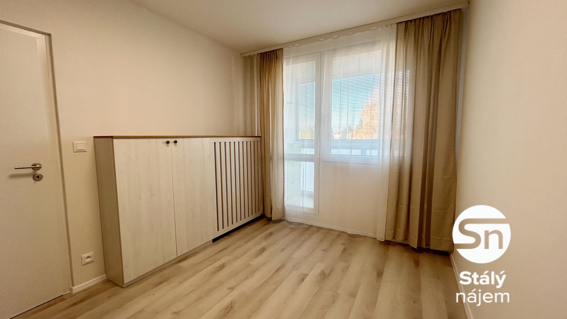 Byt dále nabízí dva samostatné pokoje – menší a větší, oba s okny do klidného vnitrobloku, záclonami, závěsy a garnýžemi. Ve větším pokoji je navíc vestavěná skříň a úložná skříňka. Chodba je vybavena vestavěnou skříní, domovním telefonem a stropním osvětlením, což zajišťuje praktické využití prostoru.
