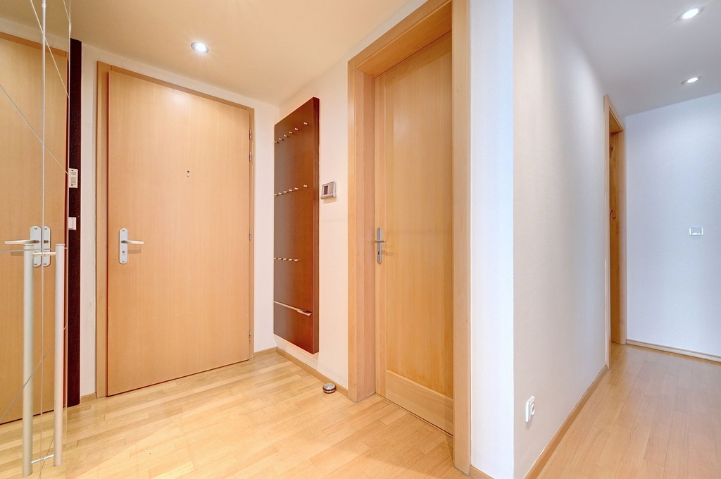 vstupní chodba s vestavěnými skříněmi, obývací pokoj s kuchyňskou linkou a krásným výhledem do vnitrobloku. tří samostatné ložnice (dvě ložnice mají en-suite koupelnu), třetí toaleta odděleně a technická místnost s pračkou. K bytu patří jedno garážové stání, které je již zahrnuto v ceně. V domě je 24 hodinová recepce s ostrahou.