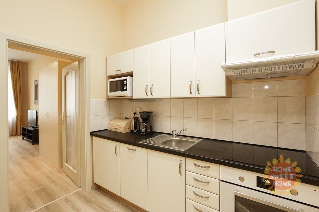 Krásný plně zařízený byt 1+1 k pronájmu o celkové rozloze 40 m2 se nachází ve čtvrtém patře udržovaného domu s výtahem. Kuchyňský kout je plně vybaven spotřebiči značky Whirlpool - sklokeramická deska, digestoř, elektrická trouba, mikrovlnná trouba, lednice, mraznička, kávovar a toustovač. V pokoji je manželská postel, pohovka a TV. V koupelně je sprchový kout, pračka, a sušička. Toaleta je součástí koupelny.