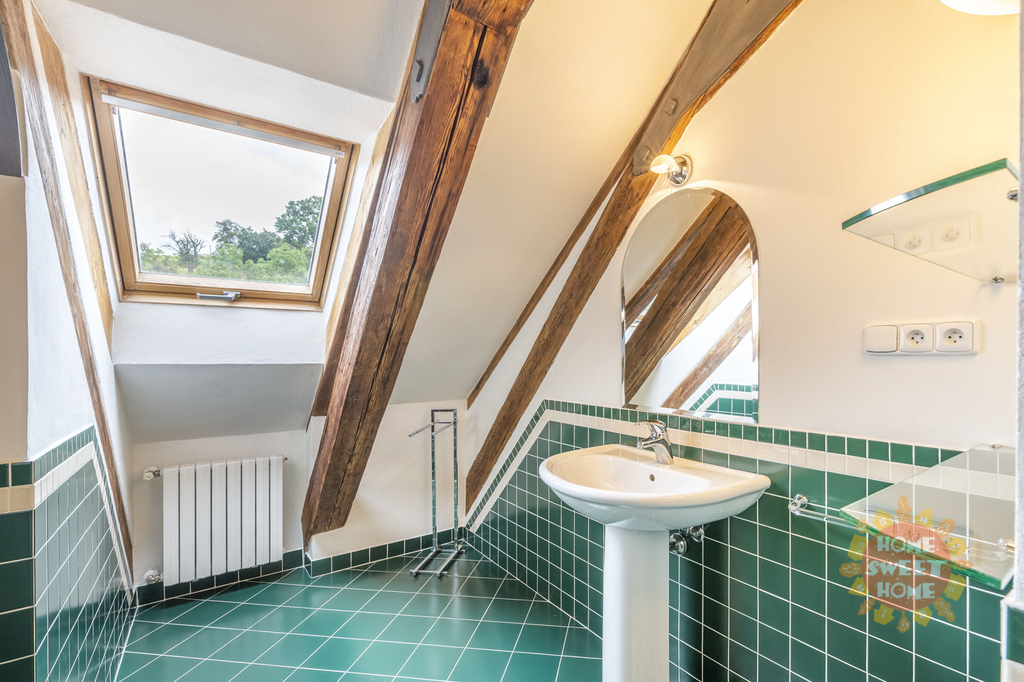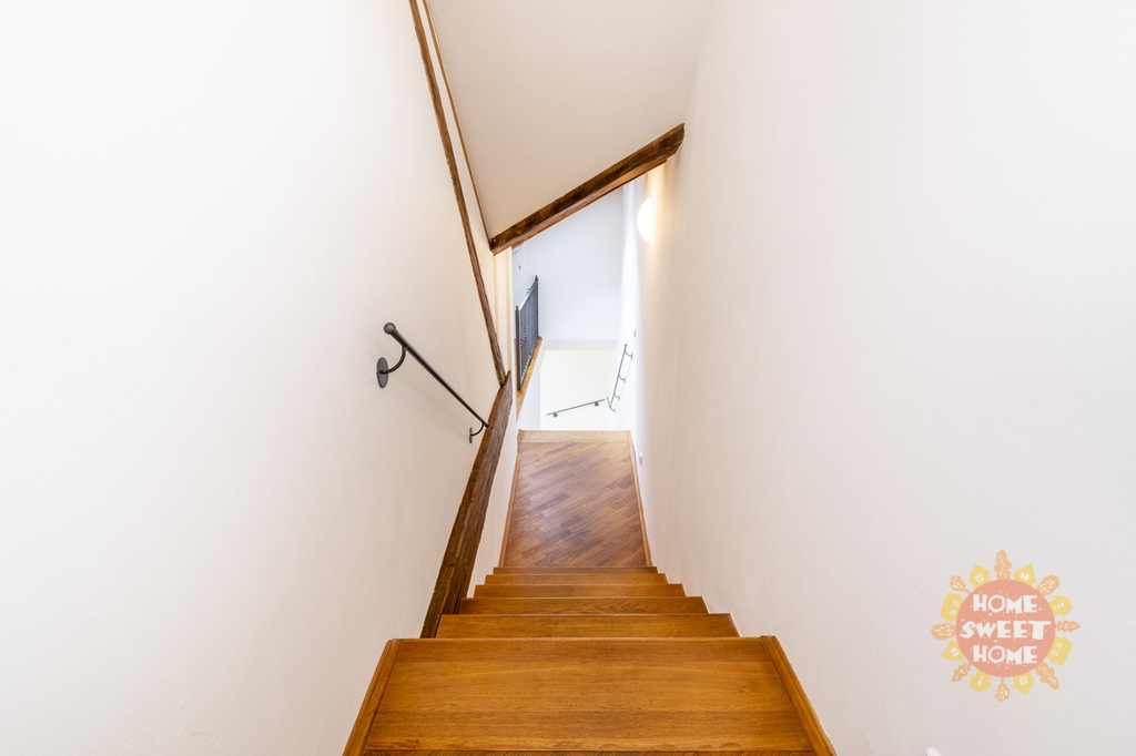 V prvním patře nalezneme dvě ložnice, koupelnu, útulný obývací pokoj s moderním kuchyňským koutem, kde je sporák se sklokeramickou deskou, trouba, lednice a myčka, ve druhém podlaží je open space prostor a koupelna. Na podlahách jsou parkety a dlažba.