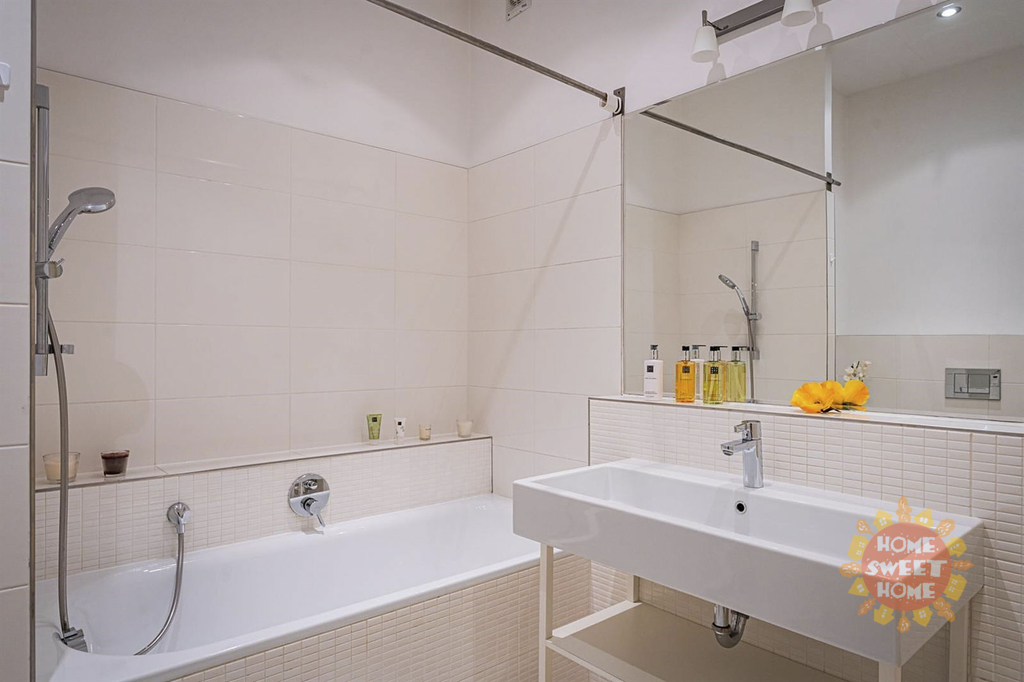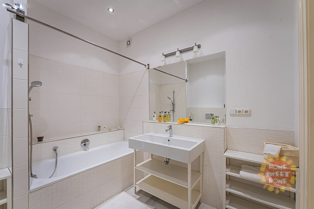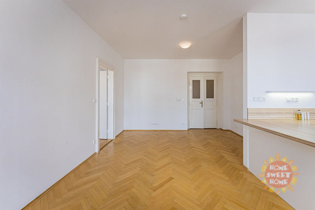 prostorná vstupní hala s vestavěnými skříněmi, obývací pokoj s moderní plně vybavenou kuchyní, jeden samostatný pokoj, koupelna s vanou a toaleta je zvlášť. Vysoké stropy, krásné dřevěné parkety - to vše podtrhuje historický avšak moderní ráz tohoto bydlení.