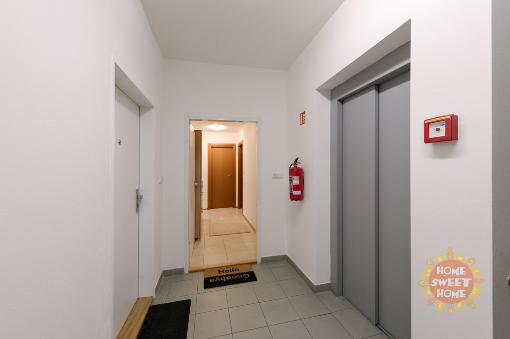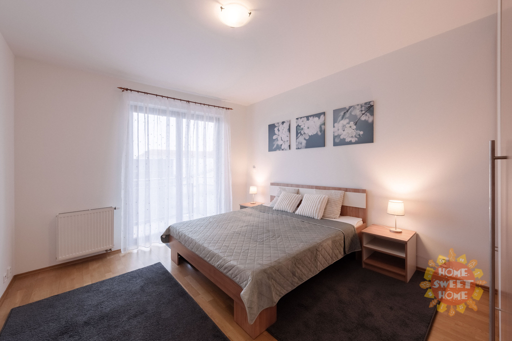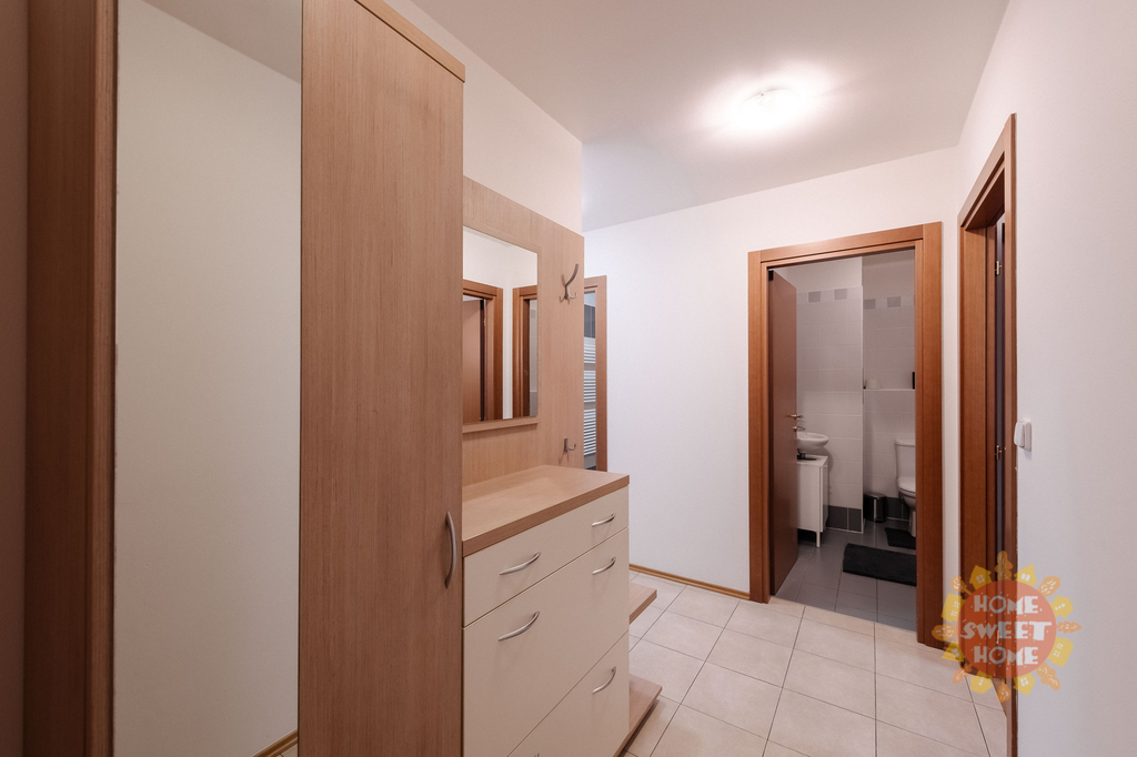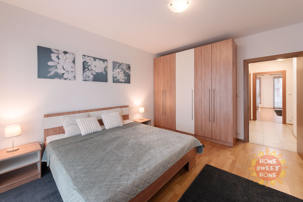 vstupní chodba se šatní skříní a botníkem (7 m2), obývací pokoj (34 m2) vybaven sedací soupravou, jídelní stůl se židlemi, konferenčním stolkem, stolek pod TV a TV (vše nové), kuchyňská linka vybavená veškerými spotřebiči (lednice, sklokeramická deska, myčka a mikrovlnka), vstup na terasu orientovanou do vnitrobloku vybavená zahradním nábytkem ložnice (16,40 m2) vybavená kvalitní pohodlnou postelí, vestavěná skříň, noční stolky s lampičkami a vstup na balkon, druhý pokoj (10 m2) vybavený postelí, skříní, pracovní stolem se židlí a křeslo, koupelna (4,20 m2) s vanou a toaletou, další toaleta (2,91 m2) odděleně a pračka. Na podlaze jsou koberce, dřevěná podlaha a dlažba. Součástí pronájmu je jedno garážové stání.