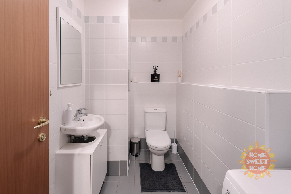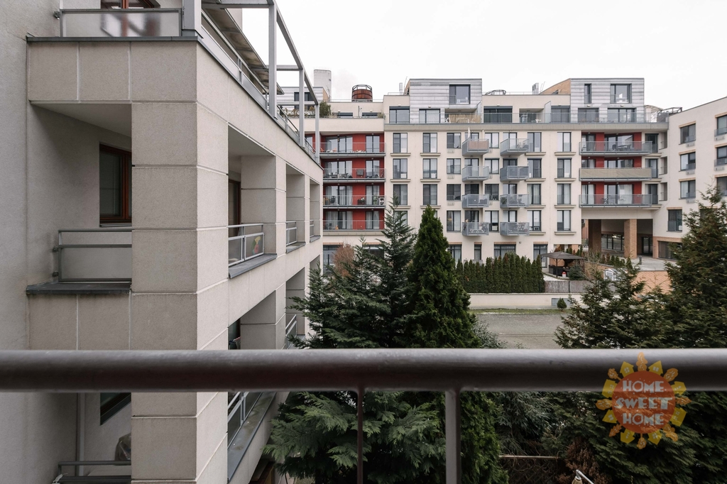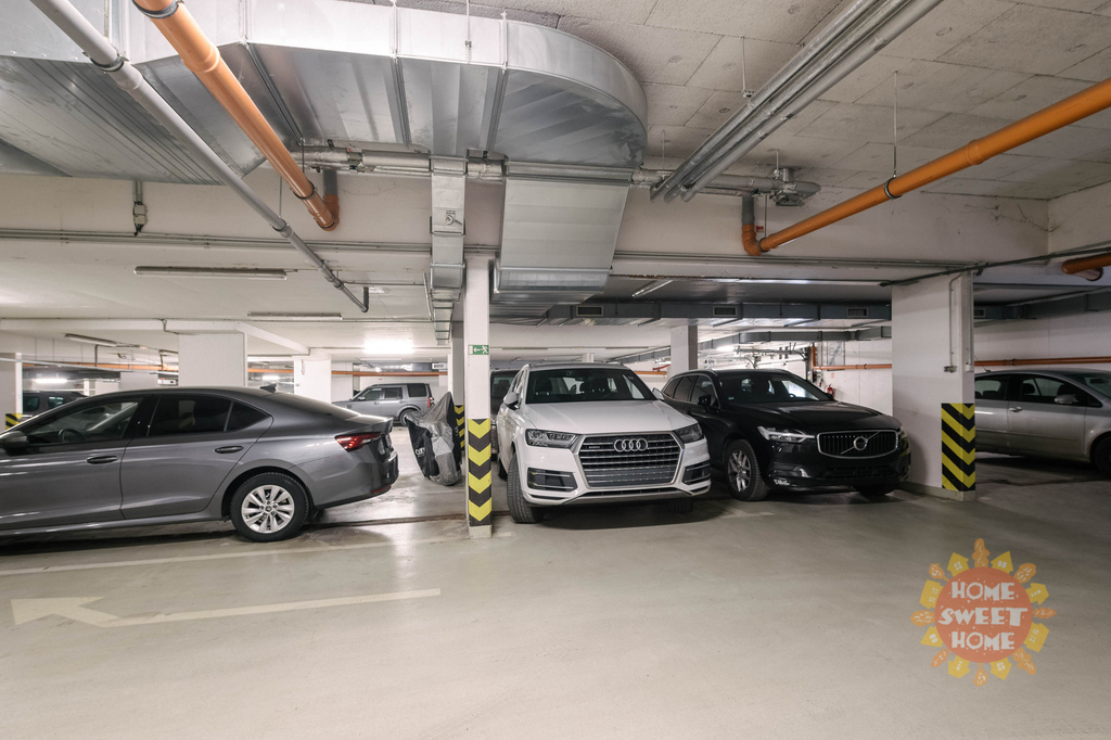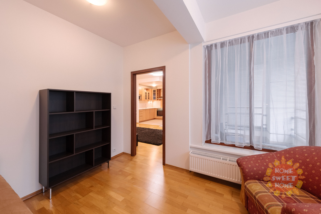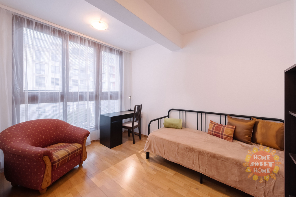 vstupní chodba se šatní skříní a botníkem (7 m2), obývací pokoj (34 m2) vybaven sedací soupravou, jídelní stůl se židlemi, konferenčním stolkem, stolek pod TV a TV (vše nové), kuchyňská linka vybavená veškerými spotřebiči (lednice, sklokeramická deska, myčka a mikrovlnka), vstup na terasu orientovanou do vnitrobloku vybavená zahradním nábytkem ložnice (16,40 m2) vybavená kvalitní pohodlnou postelí, vestavěná skříň, noční stolky s lampičkami a vstup na balkon, druhý pokoj (10 m2) vybavený postelí, skříní, pracovní stolem se židlí a křeslo, koupelna (4,20 m2) s vanou a toaletou, další toaleta (2,91 m2) odděleně a pračka. Na podlaze jsou koberce, dřevěná podlaha a dlažba. Součástí pronájmu je jedno garážové stání.