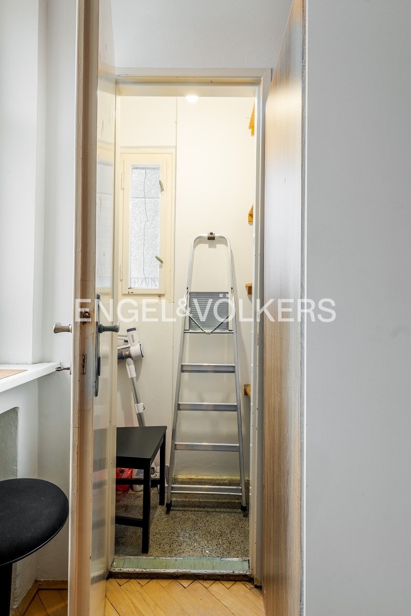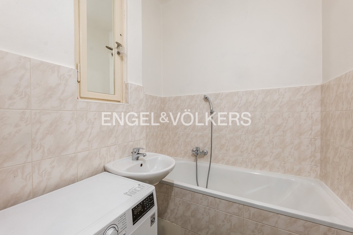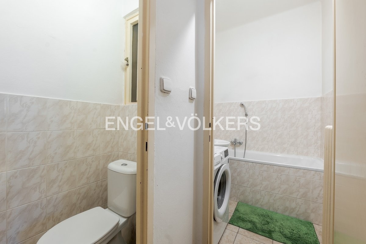 Studio ve čtvrtém nadzemním podlaží činžovního domu s výtahem je orientováno do klidného vnitrobloku. V obývacím pokoji je praktické spací patro, šatní skříň, pohovka a na podlaze jsou zachovalé dřevěné parkety.