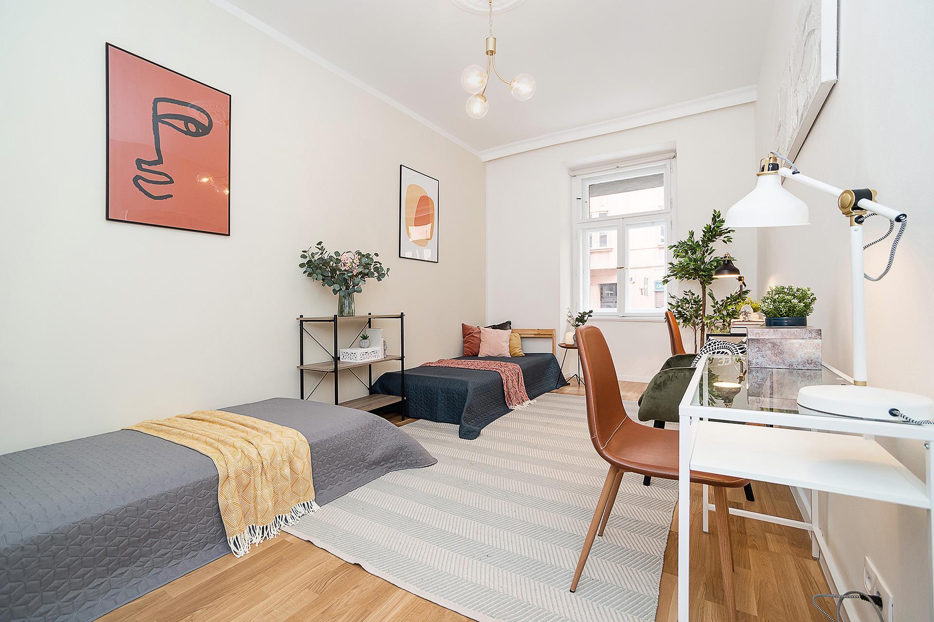 Dispozice bytu nabízí obývací pokoj s kuchyňským koutem, tři samostatné pokoje využitelné jako ložnice, dětský pokoj či pracovna. Hlavní ložnice disponuje francouzským oknem s výhledem do zeleně. Dále byt disponuje koupelnou se sprchovým koutem a toaletou, druhou samostatnou toaletou, technickou místností a vstupní chodbou s dostatkem místa pro úložné řešení.