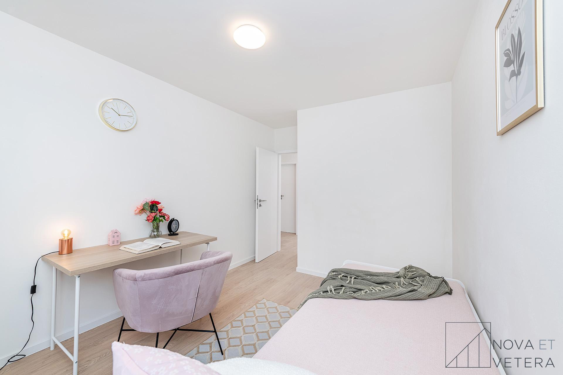 Dispozice nabízí prostorný obývací pokoj s kuchyňským koutem a čtyři samostatné pokoje vhodné jako ložnice, dětské pokoje nebo pracovna. Hlavní ložnice má přístup na lodžii o velikosti 3 m². Koupelna je vybavena sprchovým koutem, toaleta je oddělená. Vstupní chodba a technická místnost poskytuje dostatek místa pro úložné prostory. K bytu náleží sklep o velikosti 3 m².
