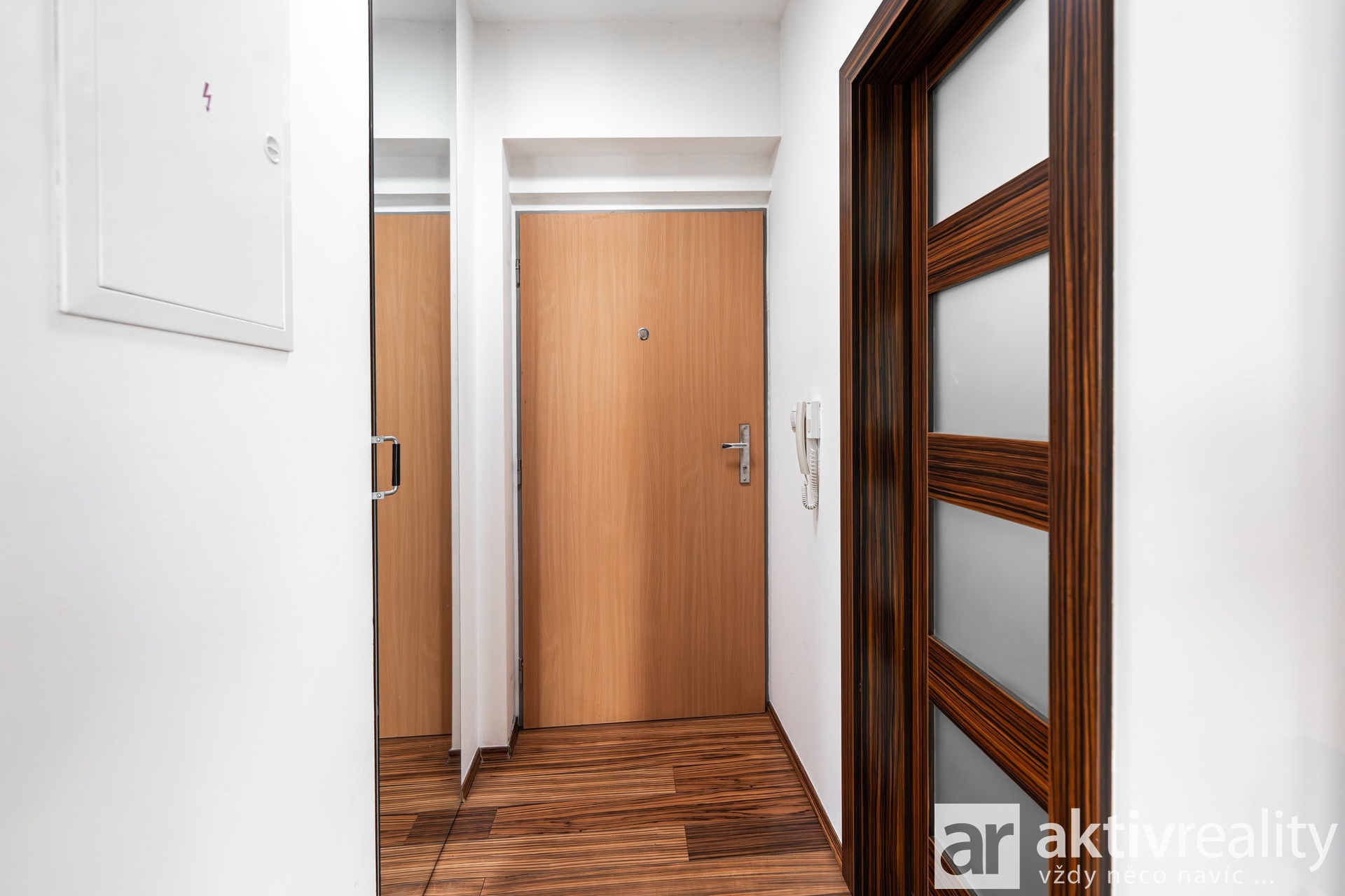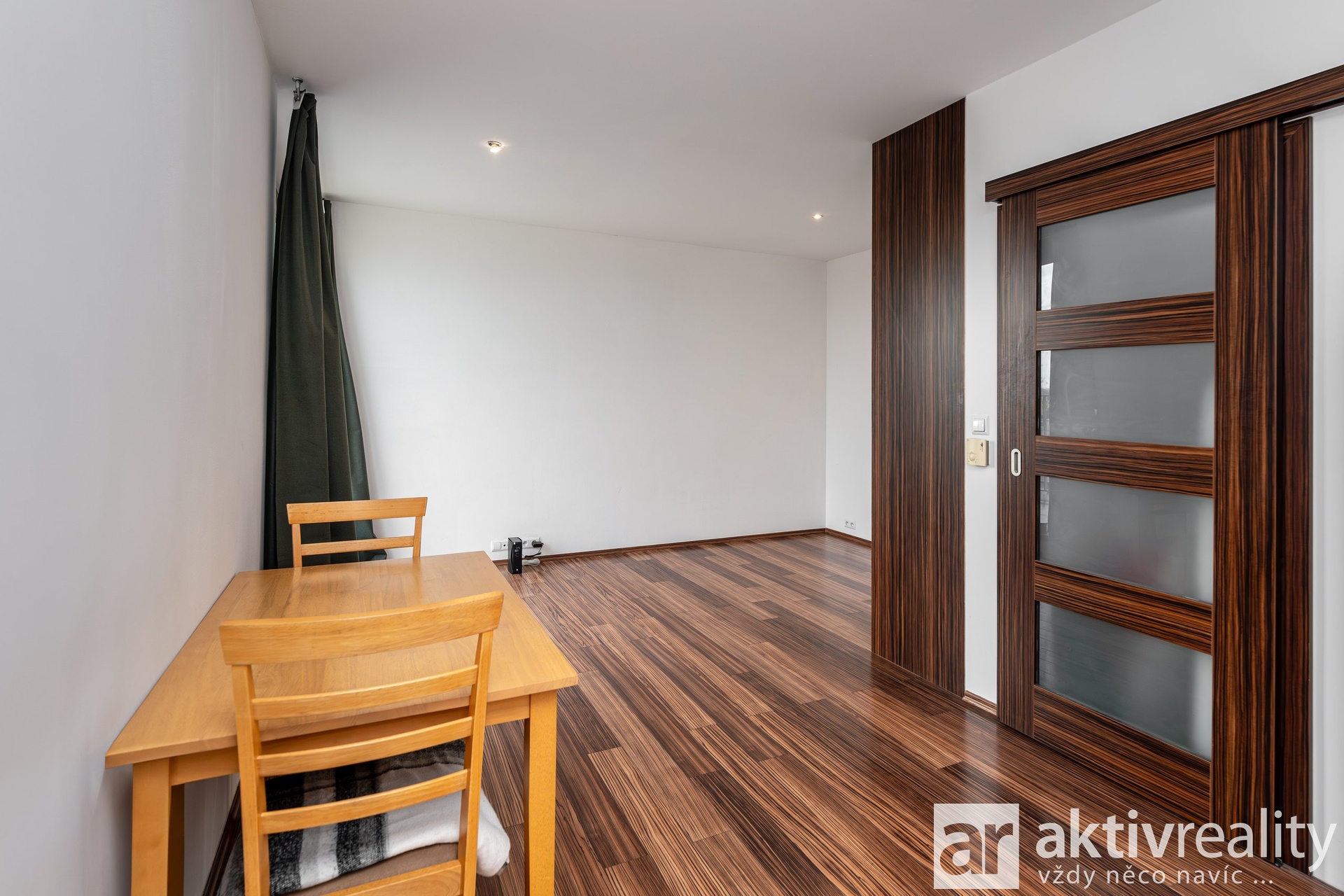 Interiér je účelně zařízen. Kuchyňská linka je vybavena lednicí, mikrovlnnou i elektrickou troubou, sklokeramickou deskou s odsáváním. V koupelně se nachází elegantní skleněný sprchový kout. Obytný prostor (23,5 m²) působí svěže a vzdušně díky dvěma velkým balkonovým dveřím vedoucím přímo na terasu. Praktickým prvkem jsou vestavěné skříně – jedna zrcadlová ve vstupní chodbě a druhá v obytné části. Posuvné interiérové dveře šetří prostor, zatímco bezpečnostní vstupní dveře zajišťují klid. Chodba i koupelna mají denní světlo díky stropním zrcadlovým tubusům. Topení je dálkové s konvektory zabudovanými v podlaze. Budova má energetický štítek třídy C, což znamená nízké provozní náklady. Měsíční poplatky do SVJ jsou aktuálně 2.900,- Kč.