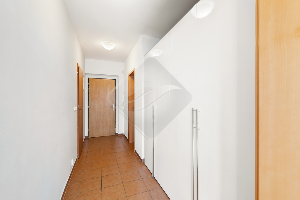 Dispozice bytu nabízí prostorný obývací pokoj spojený s kuchyňským koutem, který je plně vybaven moderní kuchyňskou linkou se spotřebiči, včetně vestavěné lednice, trouby, varné desky a digestoře. V obývací části je dostatek místa jak pro pohodlné sezení, tak i pracovní nebo jídelní kout. Koupelna je vybavena sprchovým koutem, toaletou a umyvadlem, vše v moderním standardu. V předsíni jsou vestavěné skříně, které poskytují dostatek úložného prostoru.