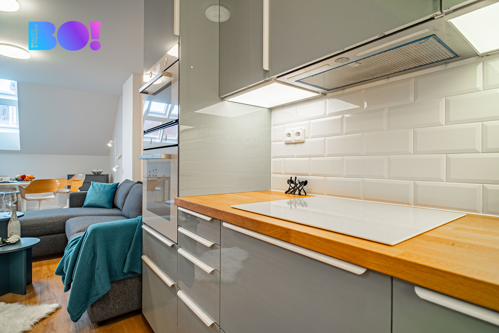 The living room is spacious, connected to a modern kitchen equipped with high-quality appliances including an induction stove and built-in ovens. The apartment features a bathroom with a large walk-in shower, toilet, and sink. Heating is provided by centrally controlled underfloor heating. The building has undergone a complete renovation and is clean, insulated, and safe. Street parking is available in the vicinity.