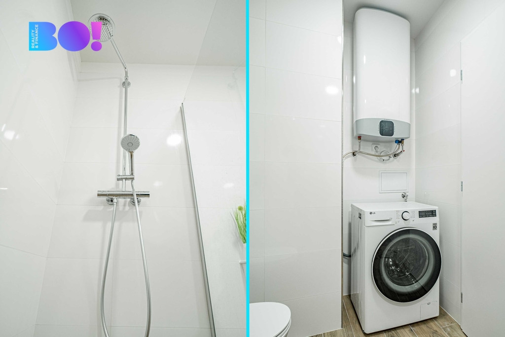 V bytě se nachází koupelna s velkým walk-in sprchovým koutem, toaletou a umyvadlem. Podkrovní zóna pro spaní je umístěna pod zkosenou střechou a nabízí dostatek místa pro velkou postel, která také patří do vybavení nemovitosti. Dále je byt vybaven video systémem, který umožňuje vzdálené otevření vchodových dveří přímo z bytu, což přidává na komfortu a bezpečnosti. Bytová jednotka se nachází v podkroví s přístupem po zrenovovaném, dobře osvětleném schodišti bez výtahu a částečně přes otevřenou pavlač. Vstup do bytu je chráněn krytým zádveřím.