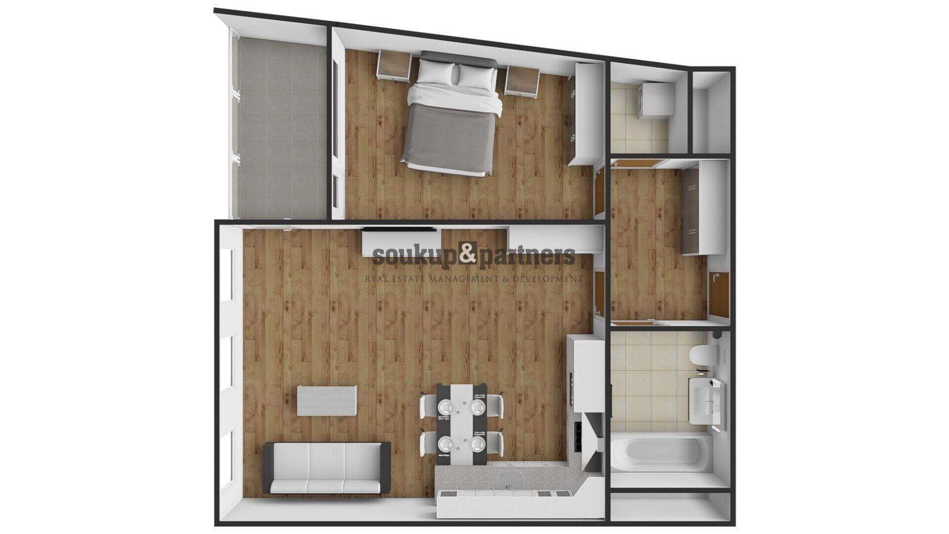Byt má užitnou plochu 53,3 m² a díky lodžii o velikosti 5,5 m², orientované na západ, nabízí příjemné místo k posezení i relaxaci při odpoledním a večerním slunci. Celková podlahová plocha včetně lodžie a sklepa činí 62 m². Dispozice je praktická, vzdušná a nabízí dostatek úložného prostoru včetně samostatné komory.