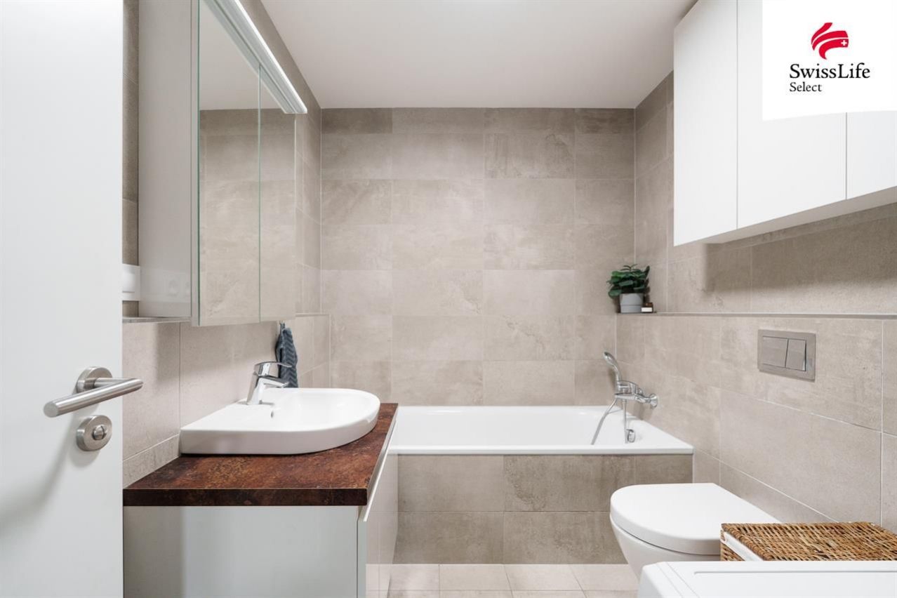 Koupelna je vybavena umyvadlem, toaletou a vanou značky Villeroy and Boch standard, který podtrhuje kvalitu celého bydlení. Musím zmínit ještě další samostatnou toaletu, což je velmi praktické.