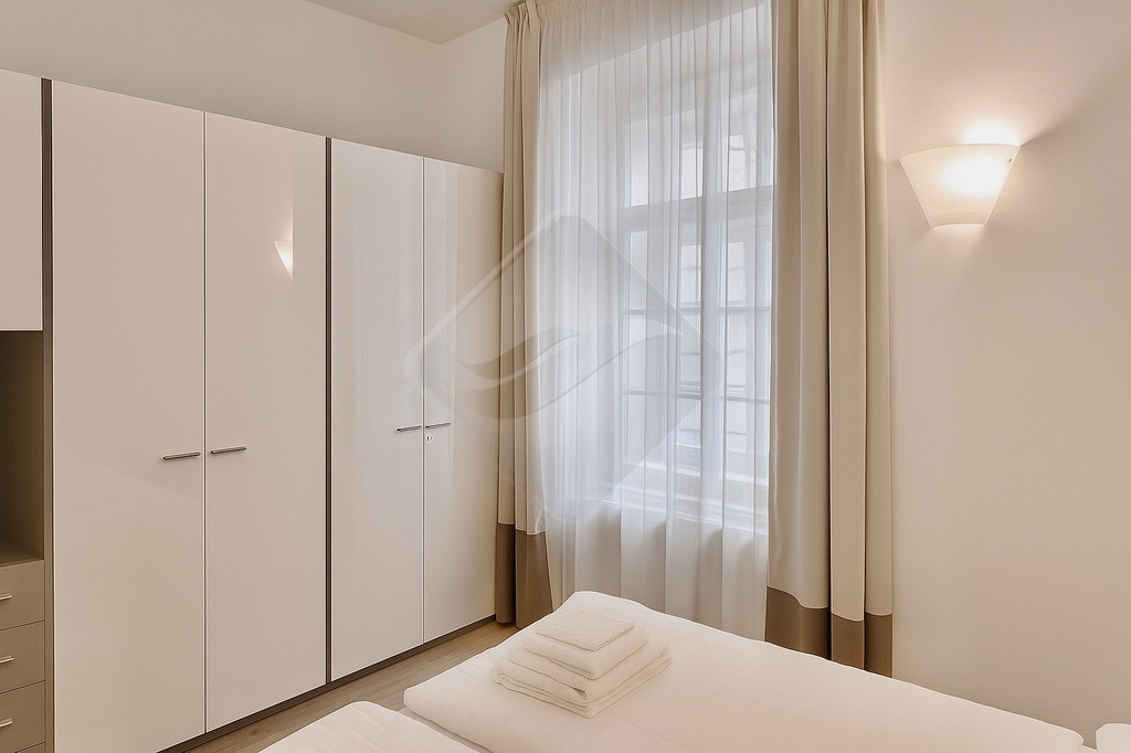 Dispozice bytu je velmi praktická a komfortní. Dominantou je prostorný obývací pokoj s kuchyňským koutem a nádherným výhledem na kostel svatého Petra na Poříčí. Dvě samostatné ložnice zaručují dostatek soukromí – ke každé z nich navíc náleží vlastní koupelna s toaletou. Jedna koupelna je vybavena vanou, druhá sprchovým koutem. Součástí bytu je také samostatný prostor pro pračku a prostorná vstupní chodba. Kuchyň je plně vybavena vestavěnými spotřebiči, v ložnicích jsou velké úložné prostory.